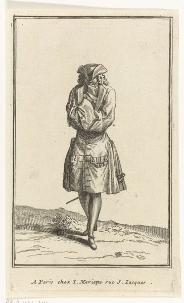 Curator: I find myself drawn to the almost Dickensian character etched into this engraving. Cornelis Saftleven created this print, "Manke Man," sometime between 1645 and 1706. It really throws you into another world, doesn't it? Editor: It does. My first thought? Tragic clown meets street philosopher. There's something undeniably theatrical about him, yet shadowed by what seems to be misfortune and marginality. Curator: Indeed! Saftleven, known for his genre scenes and narrative art, captures the Baroque era's fascination with both the grotesque and the everyday. The engraving medium really lends itself to highlighting texture and character, wouldn't you agree? Editor: Absolutely. That hat practically screams 'texture'. Look closer at that script he's holding too – what an interesting symbol, perhaps an ironic declaration by someone who seemingly relies on the kindness of strangers. Are we seeing, in his vulnerability, a comment about perception itself? Curator: Good eye! That paper may well hold verses. Crippled though he is, holding up verses relates to that sense of "being seen" even at his state. And what to make of the crutch strapped to what looks like his bare leg! Saftleven leaves it up to us to invent the "whys" behind him being an unfortunate. Editor: The strap reads to me as ingenuity – or, to put it more darkly, an unwillingness to truly seek aid. To think he fashions his own strange, uncomfortable solution... which speaks volumes. The details of Baroque genre paintings never stop offering new thoughts on humanity and culture. Curator: And so many readings layered within the character—perhaps he is an exile of his society? I love these intimate portrayals that pull us so deeply into personal and symbolic imaginaries. Editor: Me too! I'm still chewing on the strangeness and drama he suggests through such a modest print.