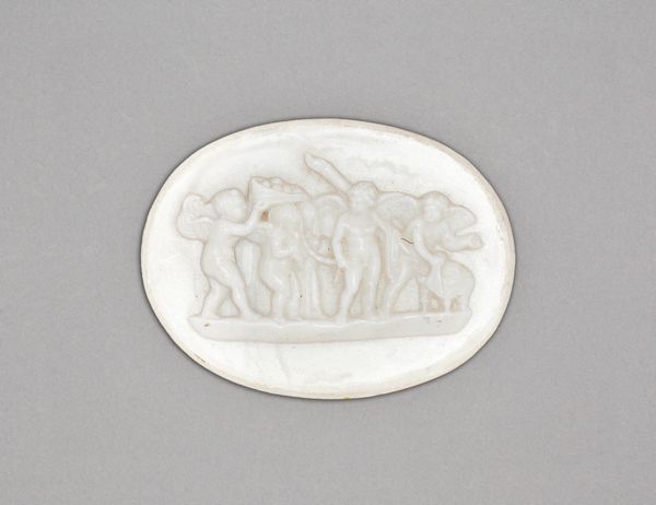 Curator: This is a ceramic relief medallion created by the Wedgwood Manufactory in the early 19th century. It calls to mind ancient Greek and Roman art with its neo-classical motifs. Editor: It strikes me as incredibly austere and cool—almost clinical with its pure white color. The shallow relief lends a sense of quiet detachment, but the scene on the left does introduce a dynamic feel. Curator: Precisely. We see a figure, likely a charioteer, actively engaged with powerful horses pulling a chariot. A narrative moment frozen in ceramic. On the right is a bust, probably depicting a goddess crowned with foliage and symbolic stars on her head, embodying divine serenity and poise. Editor: Right. But what are the implications here? A medallion manufactured centuries later in a style inspired by the art of the past, specifically ancient Greece and Rome? Does this tell us how ancient myths were refashioned to deliver different political meanings and cultural authority to very different demographics during the rise of colonial empires in the nineteenth century? Curator: The echo of Greek and Roman mythology connects viewers to foundational cultural narratives. Medallions like this one became fashionable status symbols, demonstrating one's erudition and cultivation of a neo-classical aesthetic. Editor: Fascinating, but it does raise the question of elitism. What meaning would that have for working class women struggling with limited employment prospects during the Industrial Revolution, who might not have enjoyed classical educations in the original Greek or Latin? Curator: Absolutely. And let’s think about function, too. Perhaps it was part of a larger decorative program or intended for personal adornment—worn close to the body, embodying cultural aspirations. The act of owning, displaying, and even wearing this object then reinforces those same social hierarchies and aspirations. Editor: Well, looking at the material of this decorative ceramic, it has me considering the wider reach and reproduction of artwork for middle- and upper-class collectors of this period, making artwork portable and, literally, wear-able, especially among Victorian society, and later distributed more widely throughout the rise of modern industrial capitalism. Curator: Indeed. Even on such a small scale, it reflects how visual symbols retain immense power, bridging time and cultural contexts. The symbols become both universal and culturally-relative. Editor: The quiet stories these silent forms still provoke remind us how artworks reflect broader societal power struggles, then as now. It provides new, but also older contexts.