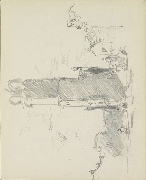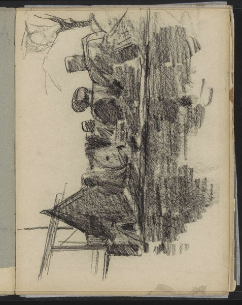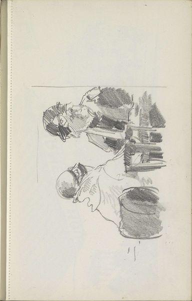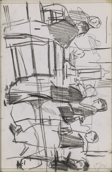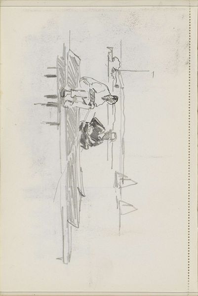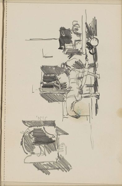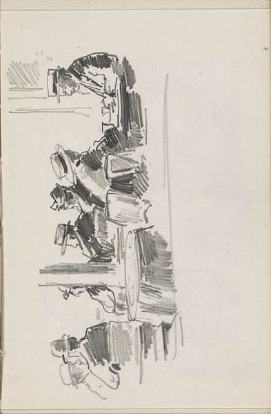 Editor: This pencil drawing, "Mannen die biljart spelen in een café" – Men Playing Billiards in a Cafe – was created by Cornelis Vreedenburgh around 1935 or 36. The sketchiness really gives you a sense of movement, almost like a snapshot. What do you see in this piece, particularly in relation to its context? Curator: This sketch is intriguing because it highlights the process of making, before any ‘finished’ product. Vreedenburgh captures a mundane, working-class scene, focusing not just on the pastime itself, but on the architecture that facilitates this activity; its lines are blurred to capture the architecture as a physical embodiment of community and the everyday lives of those who frequented cafes, reflecting perhaps leisure in interwar Europe. Editor: So, you're saying the choice of subject, everyday people, emphasizes the material conditions of their lives at this time? Curator: Exactly. The seemingly disposable nature of a pencil sketch adds to this reading, contrasting high art with everyday experience. Furthermore, considering the means of distribution, we question: was it intended for an elite art audience, or would this have been disseminated via popular, possibly even mass produced imagery, to reflect social norms? The work encourages considering the social implications of depicting this subject and what this would entail about cultural production and visual language at the time. Editor: That makes me wonder about the relationship between 'high' art and casual sketches during this era. Curator: Precisely. It blurs that binary by representing a casual activity via an equally unfussy artistic creation; by prioritizing raw sketch work, we start to break down elitism around the creation of artworks at that period of time, allowing viewers to value alternative artistic statements or outputs. This prompts a discussion about artistic labor and commodification of daily experience through art. Editor: I'm now considering art and production values in completely new lights – viewing the cafe culture itself almost as material. Thank you. Curator: And I in turn have revised my own interpretation of its worth based on our dialogue about audience reach and access.