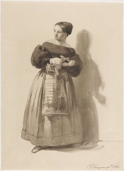 This is a drawing of a woman made by Johannes Engel Masurel. The artist skillfully employs watercolor to create soft contours and subtle gradations of tone which bring the figure to life against the stark white background. The composition is structured around the central figure of a woman. Her dress is the most substantial mass, which is contrasted against the blank canvas to amplify the sense of introspection. The woman's posture, with her head bowed and hand to her chin, suggests a moment of contemplation. The lines defining her form are delicate but assured, capturing the folds of her dress and the gentle curve of her neck. Masurel uses line and shadow to suggest weight and volume. The palette is restrained, limited to earthy browns and creams, and this enhances the drawing's quiet mood. The play of light and shadow across the figure's face and clothing invites viewers to participate in the silent, internal drama.