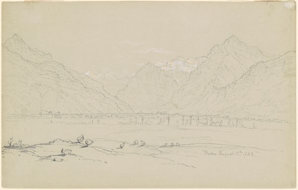 Editor: This is "Berglandschaft in Oberitalien" or "Mountainous Landscape in Upper Italy" by Johann Nepomuk Rauch, made around 1829 to 1831, using watercolor on paper. It feels so light and airy, almost unfinished. What compositional elements stand out to you? Curator: I am struck by the artist’s use of atmospheric perspective. Note how the tonal gradations create a sense of depth, receding into the distance. The application of watercolor, in washes, is critical in achieving this. Do you observe how the forms simplify and blur as they approach the horizon line? Editor: Yes, the mountains in the background are much paler and less defined. Is that typical for landscape paintings of this period? Curator: The artist's commitment to portraying depth is very revealing here, the formal elements point us towards its significance. The layers of hills are more than literal: consider their geometric structure, in terms of receding planes. Can you see how Rauch divides the image into horizontal bands, emphasizing recession? This is further accentuated by the strategic placement of dark and light tones. Editor: It's subtle, but now that you mention it, I see how the lighter areas lead my eye further back. Curator: Indeed. Even the perceived incompleteness enhances this. Consider the materiality of the paper, visible beneath the washes. Is it background, or a visual statement? Editor: I hadn’t thought about the exposed paper before, but now it adds another layer. Thank you for pointing that out! Curator: My pleasure! Examining its form and method shows just how compelling even an apparently simple work on paper can be.