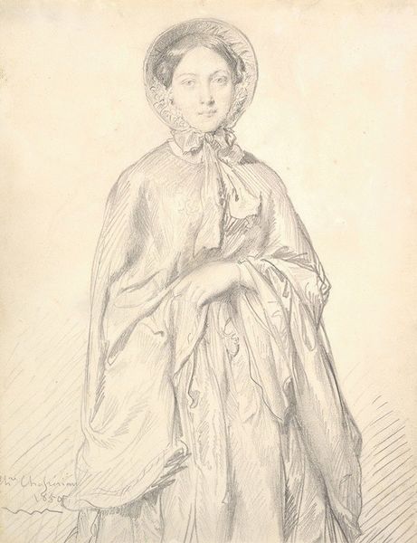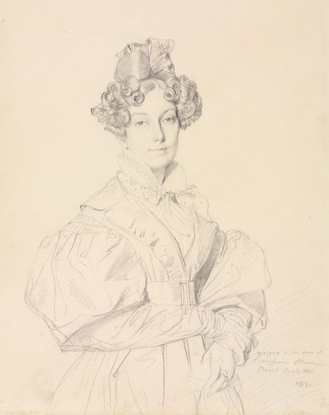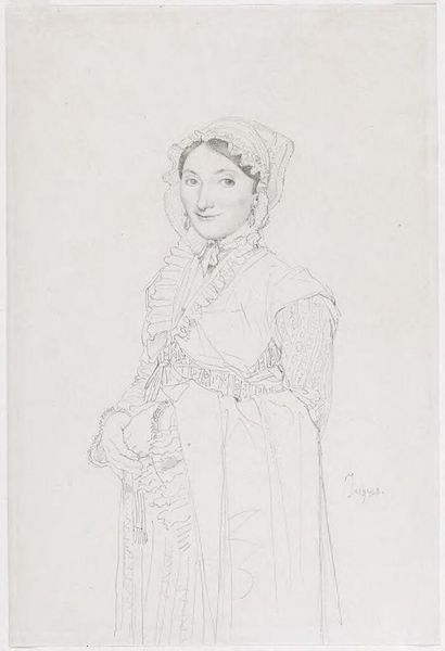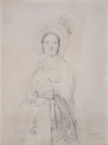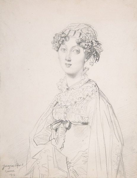 Curator: Let’s turn our attention to this pencil drawing, "Portrait of a Lady," by Jean-Auguste-Dominique Ingres, dating from around 1815 to 1817. Editor: The initial impression is light and airy. It feels like a fleeting moment captured, the delicate lines giving the woman an almost ethereal quality. There is also something about her posture and clothing suggesting material wealth but simultaneously, an understated quality to the workmanship that feels... different than typical upper class portraits of that era. Curator: Absolutely, Ingres was deeply engaged with Neoclassicism, a movement influenced by the art of classical antiquity, but as we can see here it also reflects social changes in the post-Revolutionary period, where there was still clearly high society and its associated wealth, though in new manifestations of culture and dress. The composition and the light pencil work are important to understand that time period. Editor: For me, it’s the details that speak volumes about material conditions: the paper itself, likely high-quality rag paper sourced from a specific mill, the graphite pencil, its lead carefully mined and processed. The labor involved, from the manufacture of these materials to Ingres’s skilled hand—it’s all interwoven. Did he even consider the raw resources when creating such work or only think about a fine representation of his wealthy clientele? Curator: Well, artists of that era often worked with specific suppliers and patrons, so material availability and cost would definitely have played a role in the final product. We can definitely see from this work that Ingres seemed to be mindful of capturing this woman in a new light which likely required various resources and social gatherings. Editor: Look at the ruffled collar. Lace making was a labor intensive industry. Its presence isn’t merely decorative; it tells us about access to specialized skills, possibly exploitation, and an intricate network of trade that often went unnoticed when only evaluating "high" art. Curator: Very true. We see the portrait now primarily as a symbol of status and, on some level, artistic style but in the context of early 19th-century society, you’re highlighting it was enmeshed in webs of economic and social interactions and class systems. Editor: Precisely. It reminds us that even seemingly simple pencil drawings carry within them the echoes of labor and material histories and their environmental origins. Curator: Indeed. This look has afforded a broader perspective on the subject herself and on Ingres as an artist reflecting a time of social transition.