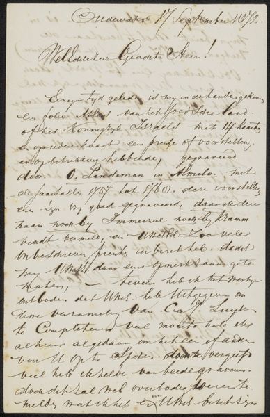 Curator: This delicate pen and ink drawing is titled "Brief aan Jan Veth," possibly created in 1894 by Jacoba Cornelia Jolles-Singels. It's essentially a handwritten letter, showcasing a wonderful example of hand-lettering. Editor: The immediacy of the writing gives me a sense of intimacy—as if glimpsing a private thought shared between two people. I'm struck by its straightforward mood and unassuming nature. Curator: Indeed, there's an intimist quality to it. The careful pen work transforms the text into art, suggesting that even a personal letter holds visual interest. I’m curious about the relationship between Jacoba Jolles-Singels and Jan Veth; it clearly transcends a simple acquaintance. Editor: Considering that handwritten letters were essential for communication in the 19th century, I am intrigued by the purpose it served beyond its sentimental nature. What social function does the act of sending a letter hold, and how is it reflective of its specific cultural context? Curator: Look closely—beyond conveying words, the beautiful script elevates its content to a more esteemed status. It suggests dedication to tradition but maybe a touch of social awareness as well. Editor: I can’t help but wonder how class and privilege intersect here. Penmanship was taught formally and informally, reflecting standards for women. I mean, who had the resources and social position to learn this craft and engage in such correspondence? This small work carries so many political issues relating to labor, social class, education and gender. Curator: That's a great point, and it connects to a larger conversation about female literacy and social expectations. Even today, calligraphy is connected with refinement, although now is mostly perceived from a commercial lens, which raises even more questions on art for consumerism versus purely an art form for intimate relations and social awareness. Editor: Exactly. This artwork provides such valuable insight on cultural production through handwritten mediums and brings awareness to modern standards of design today. It invites so many opportunities to reflect on cultural memory! Curator: This little note really sparked some amazing thoughts; I think it definitely achieves this blending of aesthetic intent and historical value!
