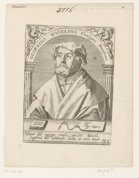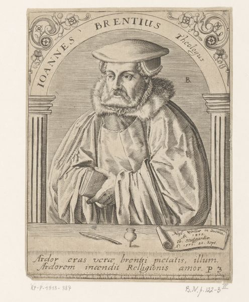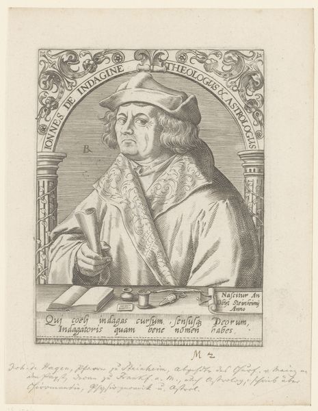 Curator: We're looking at Theodor de Bry's portrait of Johannes Stöffler, made between 1597 and 1599. This print is an engraving, part of the Rijksmuseum collection. Editor: My first thought is the stark, contemplative feel of the portrait, almost scholarly, certainly suggesting a person of intellect. The shading and detail captured with just engraving is incredible. Curator: Exactly. De Bry was known for his detailed engravings, and Stöffler was a highly respected mathematician, astronomer and instrument maker. The print served an important function, spreading his image, legacy and ideas among intellectuals of the time. Think of it as a very early form of academic celebrity endorsement! Editor: I see what you mean. It's striking how carefully Stöffler’s image is curated – almost literally framed – by the columns and floral details surrounding the central portrait. There's something inherently political about controlling how people remember him, right? The inscription reinforces his importance. "He traversed the earth and the stars," quite the epitaph. Curator: Indeed. The symbols included – the armillary sphere and geometric instruments – serve as constant reminders of his contributions to the sciences. It’s a perfect example of the visual language that the Renaissance used to construct and reinforce societal hierarchies of knowledge and power. Stöffler’s portrait reinforces his important status and role as a key intellectual figure in early modern Europe. Editor: The power dynamics inherent in the Renaissance fascinate me. There’s Stöffler depicted as a master of knowledge, set against the backdrop of significant social upheavals and inequalities of that period. Seeing the individual is fascinating but seeing the larger forces is truly revealing about society's biases, I think. Curator: Absolutely. Analyzing it, then, also helps us see these patterns playing out within society as a whole and reflect on contemporary inequalities and image creation that surround us now. Editor: It all speaks volumes, doesn't it? Curator: It certainly does.
