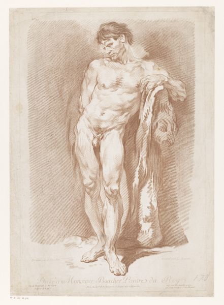 Jan Hoogsaat made this drawing of a seated male nude holding a staff, with pen in brown, and brush in brown, sometime between 1664 and 1750. The eye is immediately drawn to the anatomical detail rendered in brown ink. Notice how Hoogsaat uses line and shadow to define the musculature of the figure, creating a dynamic interplay of light and form. The curves of the back and shoulders contrast with the straighter lines of the staff. The figure's contemplative pose, with his head bowed and resting on the staff, may provoke feelings of pensiveness. This visual dynamic reflects broader artistic concerns of the period, where the representation of the human form was used to convey intellectual and emotional states. The drawing functions not just as an aesthetic object but also as part of a larger discourse on human existence and self-reflection.