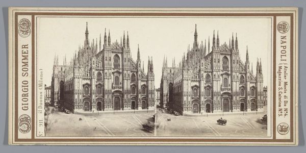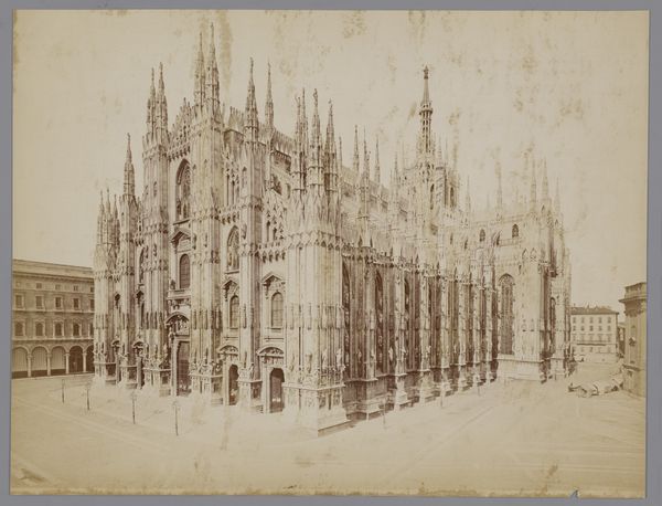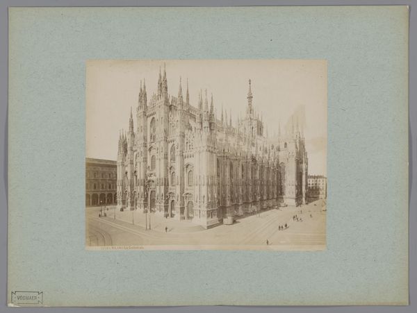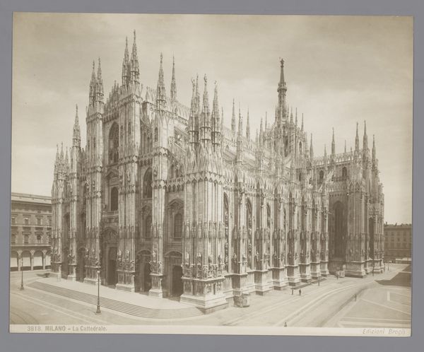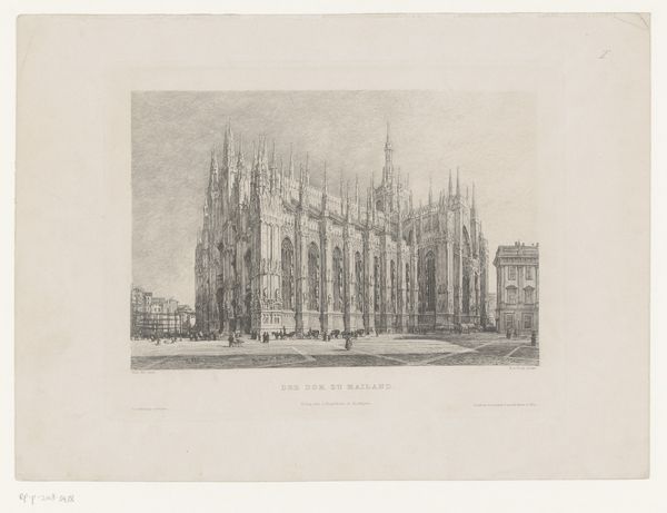 Editor: This is “Façade van de Dom van Milaan” by Filippo Naymiller, created after 1814. It's an engraving. I'm really struck by how this print captures the almost unbelievable complexity of the Milan Cathedral’s facade, making it look imposing and monumental. What can you tell me about this image? Curator: Well, given the socio-political climate of the time, and the long, complicated construction history of the Duomo, this print plays an important role in shaping the public’s understanding. Post-Napoleonic era, Milan was transitioning. The Duomo, as a symbol, becomes wrapped up in defining civic pride and identity. Do you notice how pristine the scene is presented? Editor: Yes, it looks idealized, almost like a stage set. Not really gritty like a working city. Curator: Exactly. This polished portrayal serves a purpose. It's a carefully crafted image of civic order and architectural grandeur, reaffirming values. The Duomo, plagued by funding issues and design disputes for centuries, finally becomes a source of visual unity and stability. The choice of printmaking, with its accessibility, allowed this image to circulate widely, further cementing the Duomo's symbolic weight. Editor: So, the print is not just a picture, but part of a larger cultural narrative. Curator: Precisely. Consider also the audience: tourists who could buy the print, or local citizens taking pride in their heritage. Visual imagery like this becomes a powerful tool in solidifying a sense of place and shared history. What do you make of the people depicted in the engraving? Editor: Now that you mention it, they appear almost like afterthoughts. Maybe their presence serves more to emphasize the enormous scale of the Duomo. Curator: Exactly, and the style of dress gives clues about the target audience too. The image reinforces an impression of prestige to create desire for visitors. Editor: I had not considered that before. It is fascinating to see the politics of imagery embedded in the details. Curator: Indeed, by examining how institutions and social forces intertwine, we get a much deeper understanding of its appeal and the artist's aims. Editor: I will certainly keep this in mind when observing the artwork in the future. Thanks.