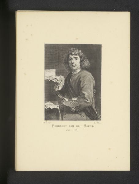 Curator: The detail in this print is remarkable; I am immediately struck by its sharp contrasts. Editor: Well, yes, it has a distinct clarity, even coldness about it. We're looking at a reproduction of a baroque engraving of Martin Desjardins before 1877, originally engraved by Gerard Edelinck after Joseph Maes. What do you make of the artist's focus on texture and materials? Curator: Texture absolutely defines the work, specifically how light falls across varied surfaces. Consider the soft rendering of Desjardins's wig, distinct from the harsh lines suggesting the drapery behind him. There's also the smooth finish to what looks like a sculpted head resting on his lap. The composition's brilliance is in contrasting those visual elements. Editor: But it's crucial to understand *how* this image came to be. Think of Edelinck as a skilled craftsman translating Maes’ vision through manual labor and immense skill. Engraving was a slow, demanding process, forcing a mediation of the artist’s and engraver's sensibilities through materials and technique. The Baroque aesthetic then elevates this production of luxury through images. Curator: That elevation, though, manifests visually. The figure is framed by architectural details, and draped fabrics evoke a theatrical sense. Formally, these components lend importance and reinforce themes of power. I mean, it fits neatly within visual tropes of the era, drawing influence from earlier portrait traditions, doesn't it? Editor: Sure, the historical portrait style signals power. Yet that is expressed here via material means. For instance, that drapery implies expensive textiles accessible only to the elite, reinforcing existing social hierarchies through consumption. This print, and prints like it, served as currency for propagating the aesthetics of the upper class through material artifacts that helped distribute them. Curator: So it is a symbolic record in itself, more than a record of the actual man, Desjardins. A portrait embodying a range of stylistic influences from past and present, reinterpreting themes of prestige with strong use of chiaroscuro and geometric balance, giving a great weight to his gaze, too. Editor: Absolutely! A copy circulating amongst people wanting to imitate and reflect prestige back onto themselves by reproducing status and propagating the class-based systems and networks on which this hierarchy depended! That’s where true value lies in art such as this!