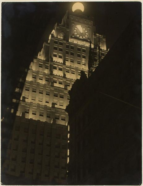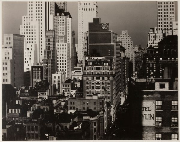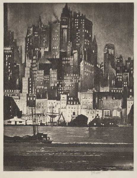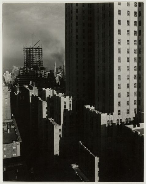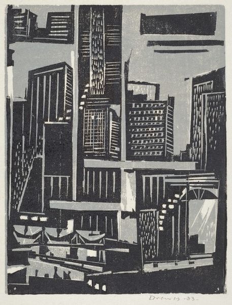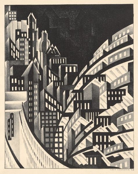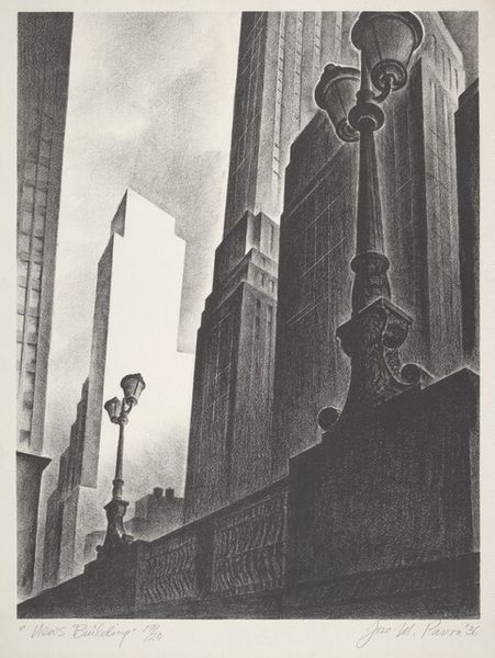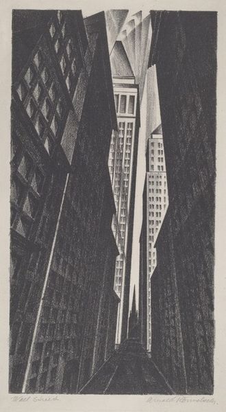 Editor: Here we have Albert Bloch's "Southern Exposure," created in 1934 using graphite. The high-contrast scene makes the buildings appear almost ominous. What aspects of its history can you tell us about? Curator: Bloch made this in the middle of the Great Depression, when a sense of starkness and even isolation gripped much of the country. There’s an emphasis on verticality that mimics both aspiration and constraint. Editor: Constraint, how so? Curator: Well, consider who had access to these architectural marvels. Were they symbols of collective progress, or did they mostly serve corporate power? Consider that the skyscrapers of this era frequently became symbols of unchecked capital, despite the fact that they visually dominated cityscapes. The shadows here are especially long, like looming anxieties. Do you notice the vantage point and the choice to look down on neighboring buildings? Editor: Yes, I hadn’t thought about that, that downward gaze makes me feel both separate and as though something is amiss. Is the work also a political commentary? Curator: Potentially. By reducing the urban landscape to a study of shadow and form, Bloch invites viewers to reflect on how architectural power affects public sentiment and societal order. Art during this era often explored themes of social critique. Editor: It really emphasizes the sense of detachment and highlights the tension between grand constructions and the wider social reality. Thanks, I had not previously picked up on all of those embedded visual references. Curator: Absolutely, this work, viewed through a historical lens, prompts a valuable reflection on the intersections of architecture, power, and public feeling during a really volatile era.