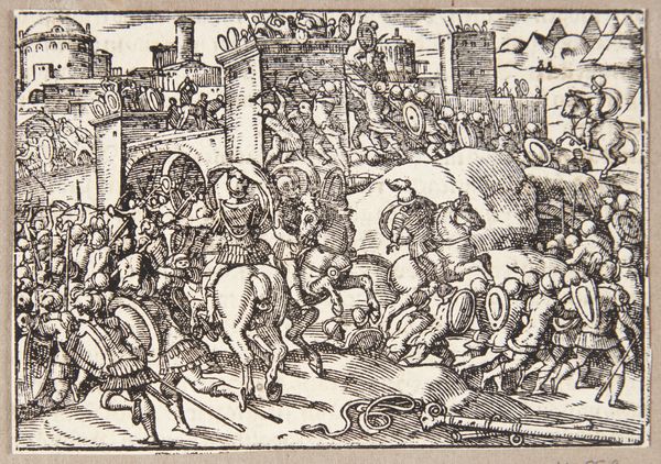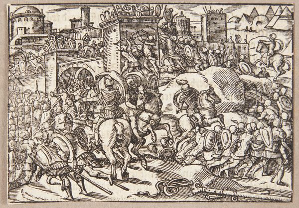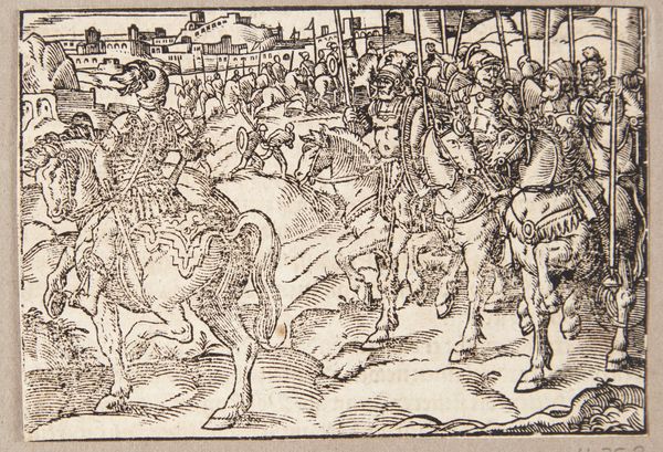 This print, "De trehundrede og seks fabiere," was made by Tobias Stimmer in the late 16th century, likely as an illustration for a book. Look closely and you'll see it's a woodcut, a relief printing process where the artist carves an image into a block of wood. The material itself, wood, significantly influences the image. The stark contrast between the cut and uncut surfaces creates bold lines and dramatic shadows. This technique requires both meticulous detail and a broad understanding of graphic impact, as each cut is final. Consider the labor-intensive process of carving away the wood around each line to create this dynamic battle scene. Woodcuts like these were crucial to the spread of information and imagery during the Renaissance, making art more accessible beyond elite circles. Stimmer's craft bridges the gap between fine art and the everyday, reminding us that art is deeply embedded in social and economic contexts.