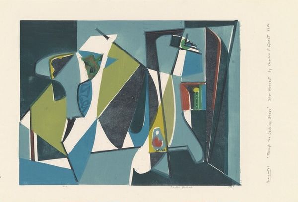 Curator: This is "Building in Space" a 1938 woodcut print by German-American artist Werner Drewes. He created this while working in the Federal Art Project. Editor: The fractured geometric planes feel disorienting and yet exciting at the same time, like a city being built, but also one that could easily fall apart. The bold, almost clashing colors add to that tension. Curator: Drewes work shifted away from expressionism towards abstraction after he was influenced by Bauhaus principles. And, his work during this period really exemplifies the anxieties around urbanism at the time. Think about the Depression Era. The city, previously understood as this space of opportunity, was now increasingly recognized as a space of mass poverty, displacement, and alienation. Editor: Yes, and Drewes does capture the disjunction between optimism and impending collapse doesn't he? The forms hover—there's no real groundedness. I’m drawn to the texture, though, particularly the wood grain. Curator: That texture reflects his dedication to printmaking as a democratic art. Accessible art production was central to the Federal Arts Project during the Depression. But despite the original motivations of this artwork being for public dissemination and consumption, Drewes work had trouble being widely recognized and supported. It makes you question the limitations of governmental support when attempting to intervene in art production. Editor: I suppose, I tend to focus more on what is included, instead of who funds it. I see echoes of Synthetic Cubism, how the interlocking planes build structure even without fixed perspective. You’re looking at multiple vantage points collapsed into a single picture. It's a really smart technique. Curator: Looking at “Building in Space," I am reminded about the larger context around New Deal art, and its complex place in shaping cultural memory in the United States. Editor: For me, it's the tension between the instability depicted and the material fact of this print; these flat shapes interlocking that creates a uniquely compelling sensation, making this composition all the more enduring.