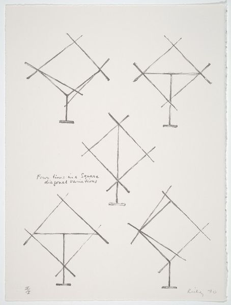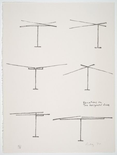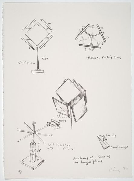 George Rickey made this print, called ‘Cube with Two Fixed and Ten Moving Lines’ in 1970, and it's pretty cool how he breaks down a sculpture into a drawing. It’s all about lines, right? The cube, like a scaffold, is drawn with these deliberate, slightly wobbly strokes. You can almost see the graphite particles on the paper, catching the light. Then you have these lines that are meant to move, jutting out, defying the cube's rigid structure. They're like thoughts escaping a box, or maybe a dance waiting to happen. What I find interesting is that Rickey's known for his kinetic sculptures, but here, he captures movement in a static form. Look at how the lines intersect, the shadows they create, it’s almost like he’s trying to trap air. It reminds me a bit of Sol LeWitt, but with a twist, because LeWitt's structures are so precise, and Rickey has this playful, almost human touch. Art’s an ongoing dialogue, each artist riffing off the last. Anyway, it's a drawing that makes you think about space, motion, and the beauty of simple forms.