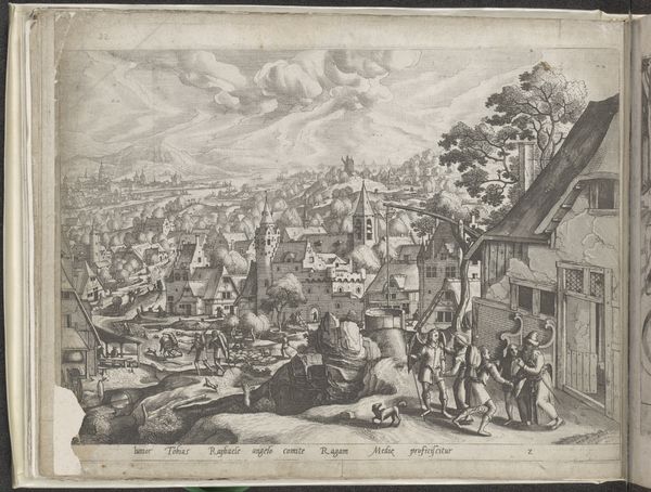 Curator: This etching, "Tobias Returns Home," created sometime between 1563 and 1567, is attributed to Johannes or Lucas van Doetechum. What strikes you first about this detailed scene? Editor: The overwhelming density of detail. Look at how closely packed those buildings are. It’s almost claustrophobic, yet the landscape sprawls far into the distance. There is such contrast between open space and constriction. Curator: This print is rooted in a pivotal narrative: the return of Tobias, from the Book of Tobit. I'm drawn to think about familial dynamics and homecomings in relation to the diaspora. How often are such returns depicted as uncomplicated and joyful? What expectations, shaped by family, society and religion, meet the returning traveler? Editor: Agreed. The artist uses line work with astonishing virtuosity, a delicate web really. Semiotically speaking, notice the use of sharp, clear lines for objects closest to the viewer, and as our eye recedes into the depth of the piece, the lines become more ambiguous. This guides the viewer into a spatial relationship, which speaks volumes. Curator: Yes, this spatial relation informs a broader discourse. Here, the story of Tobias returning to his parents intertwines with societal norms regarding familial duties, geographical displacement, and reconciliation in times of religious upheaval, or perhaps political exile. There's more than a hint of a societal demand for obedience. Editor: That contrast creates a certain tension, doesn't it? Now, focusing on its structural qualities, the way the figures and the architecture create a dynamic interplay, you’ve got these clustered buildings almost like a physical embodiment of societal pressure pushing inward and, at the same time, the freedom of landscape opening into new possibility. Curator: The materiality speaks volumes as well. That such density can be achieved with etching tools is extraordinary. Thinking about gendered labour practices, access to art education, as well as the commodification of religious narratives, further contextualizes this artwork, I think. Editor: Absolutely. Well, from a formal standpoint, considering the etcher’s engagement with texture and form really opens up questions regarding their comprehension of optics. It certainly does highlight how they perceive the world spatially and tonally. Curator: This print pushes us to think more deeply about these artistic periods and the complexities in human interaction during tumultuous periods in history. Editor: I agree, its artistic language helps to understand the period and perhaps, to reflect our place within today's equally complex landscapes.
