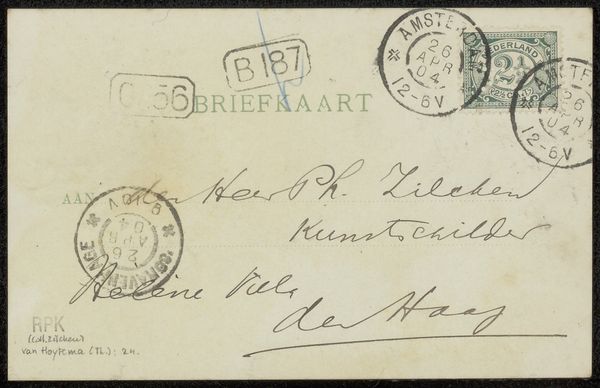 This Briefkaart aan Philip Zilcken is a postcard, likely created around the turn of the 20th century by Louis van Soest. Though modest in scale, postcards are fascinating objects when considered from a maker's perspective. The industrial production of paper, along with standardized postal systems, meant that personal communication became easier than ever before. The relatively low cost reflects the rationalization of labor and the expansion of global trade networks, and the design of the printed text shows the stylistic influence of industrialized typesetting. The handwriting, however, injects a personal element into this system of mass production and distribution. It reminds us that even in an age of increasing mechanization, individual expression still finds a way. The stamp is a clear sign of transit through a capitalist system of trade and consumerism. These material details remind us that even the simplest objects can reveal complex relationships between craft, industry, and individual agency.