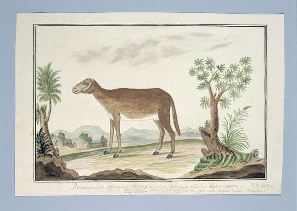 Curator: Oh, my, this strikes me as something of a shy pastoral scene—so tranquil, almost as if observed through a dreamy lens. Editor: That’s an interesting take. Let’s ground ourselves a bit. This is “Cape Ram,” likely rendered between 1777 and 1786, credited to Robert Jacob Gordon. We're looking at a watercolour, pencil, and colored pencil drawing, capturing, as you suggested, a pastoral landscape with the central figure of the ram. Curator: So, pastoral indeed! And those muted, earthy tones – they evoke such a sense of gentle observation, don’t they? The placement of the ram, almost centrally, gives him a proud yet humble bearing. He's a cultural figure, this ram. Editor: He certainly becomes emblematic, doesn't he? Rams often symbolized virility, determination, and leadership across cultures, including in antiquity. Its isolation between those trees could mean different things. Curator: Indeed. The trees framing him seem almost like symbolic guardians. Is it an evocation of paradise, perhaps? They speak to me of resilience and quiet strength. Even the unassuming watercolor technique, the subtle shadings—it adds a layer of humility to its imposing subject. Editor: Watercolors lend themselves to naturalism, that desire to represent something truthfully and authentically, right? Given Gordon's naturalist style, could this perhaps signify not just cultural meanings invested in rams but also colonial encounters with the natural world, particularly the African landscape? The text under the drawing mentions something in Dutch. Curator: Precisely! A dialogue unfolds: a cultural symbol viewed through the eye of scientific inquiry—a landscape filled with political potential and also serene nature. You've hit the nail on the head; a visual record imbued with more than simple representation. Editor: That balance, between observation and symbolic weight, colonial record and gentle artistry, makes it feel so rich to me. What do you take away as we finish up here? Curator: A profound sense of layered meaning, of seeing beyond the immediately picturesque into the deeper currents of culture and human encounter with nature. Editor: Agreed. I’m left pondering how historical and personal viewpoints merge in one seemingly simple rendering of an animal standing in a field.