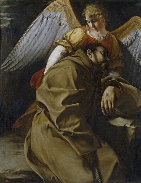 Editor: Here we have Orazio Gentileschi’s oil on canvas, "St Francis supported by an Angel," created around 1600. The subdued color palette gives it such a somber feel. What strikes you most when you look at this piece? Curator: Isn't it striking how Gentileschi captures such raw vulnerability? For me, the tenderness is palpable; look at the angel's delicate touch contrasted with St. Francis’s almost limp form. There's a beautiful, unspoken dialogue happening. Do you feel it? Editor: Absolutely. It’s almost as if the angel is not just supporting him physically but emotionally as well. The dramatic lighting certainly emphasizes that contrast, adding to the Baroque drama, right? Curator: Exactly! Gentileschi uses light and shadow so cleverly, almost like a stage spotlight, guiding our eye. And beyond the immediate drama, think about the historical context. It's early Baroque, Rome is wrestling with religious reform, and here we have a saint, typically portrayed as powerful, shown in a moment of profound human weakness. It's surprisingly intimate, isn't it? Editor: Definitely makes you rethink the traditional, heroic depictions. So, the artist is humanizing St. Francis, perhaps inviting the viewer to connect with him on a more personal level? Curator: Precisely. He strips away the untouchable saintliness and reveals the fragile humanity. And I wonder if that was intended to be a comment on the Church itself? That it too should be vulnerable, perhaps more compassionate? Or am I reading too much into it? Editor: No, that makes complete sense! Seeing this has certainly given me a fresh perspective on Baroque art and how it engages with its subjects. It’s far more nuanced than I initially thought. Curator: Agreed! And isn't that the beauty of art? Always offering us new ways to see, feel, and think?