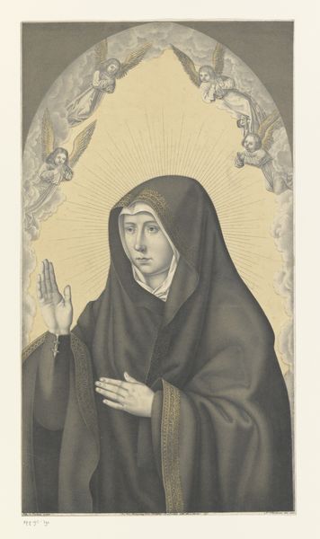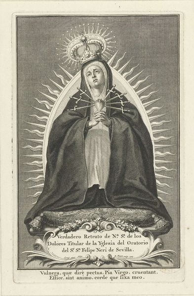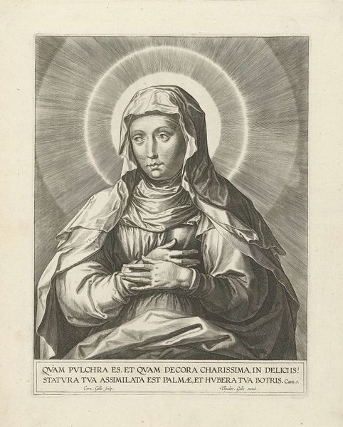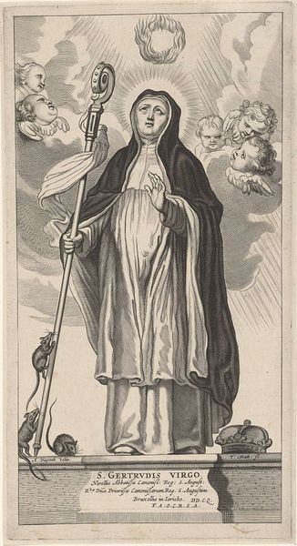 Editor: We're looking at "Heilige Drie-eenheid in Maria" - or "Holy Trinity in Mary" - a print by Jean Boulanger, created sometime between 1616 and 1680. It's currently held at the Rijksmuseum. The image itself, with Mary surrounded by clouds, gives it a soft, almost dreamlike quality. How do you interpret this work? Curator: What interests me most about this print is its visual representation of a complex theological concept within a specific socio-political context. The engraving uses the then-popular imagery of the baroque period to create a very potent devotional tool, and understanding how this imagery was disseminated is crucial. Consider the historical relationship between religious art, state power, and individual faith at the time it was created; the period saw great upheavals such as the Counter-Reformation. Can we really separate this work from such sociopolitical dynamics? Editor: That’s fascinating. So, beyond the surface-level depiction of the Holy Trinity and Mary, it also operates as a commentary of, or perhaps even propaganda related to the political role of Catholicism? Curator: Precisely! Remember, art in the Baroque period was frequently used to reinforce the authority of the Church and to stir religious sentiments amongst believers. The engraving’s composition and its accessibility as a print also contributed to how it conveyed messages. Now, where and how do you think such art pieces would have been encountered by people, then? Editor: That makes so much sense now. It highlights how deeply intertwined art, religion, and politics really are! Curator: Exactly, and examining these connections can radically transform our understanding of art history and the broader context that shaped it.