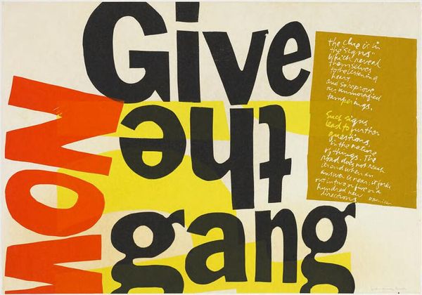 Curator: This is Corita Kent's "a man you can lean on," currently housed at the Harvard Art Museums. Editor: It's immediately striking—the bold typography and limited color palette create such a dynamic visual field. Curator: Kent often used text and vibrant colors to convey messages of hope and social justice, rooted in her Catholic faith. The tilted phrase, overlaid on the words "EAST HIRST" is certainly thought-provoking. Editor: The composition is quite interesting; the layering of colors and text generates a sense of depth, yet the image remains flat. Curator: The phrase itself is iconic, suggesting support and dependability, perhaps reflecting Kent's commitment to community. "EAST HIRST" might reference a geographical location imbued with personal meaning. Editor: Absolutely. The interplay between the textual and the abstract formal elements invites us to decipher the underlying message. Curator: It’s a powerful example of how art can blend personal expression with broader social commentary. Editor: A vibrant work that resonates on both a visual and conceptual level.