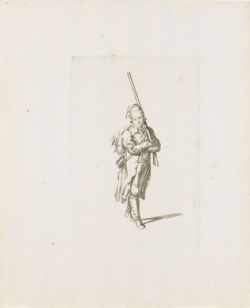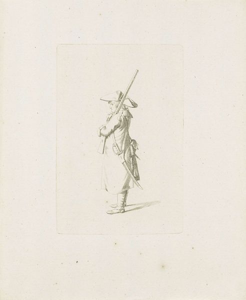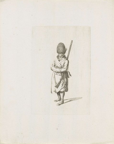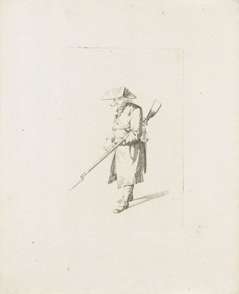 This drawing of a standing French soldier was made by August Christian Hauck. Executed in delicate lines, the subtle tones and textures of the drawing bring the soldier's uniform to life. The choice of drawing as a medium is significant; while painting might convey grandeur and heroism, drawing offered a more immediate and intimate connection to the subject. The artist carefully renders the details of the soldier's attire, from the elaborate hat to the folds of his coat, illustrating the craftsmanship involved in producing these military garments. Consider the social context: Hauck was working in a time of political upheaval and military conflict. The soldier embodies the labor of war, standing ready to serve his country. But it also evokes the complex network of production required to equip and sustain an army. By focusing on the material aspects of the soldier's attire, Hauck invites us to consider the human cost of conflict, and recognize that even the most ordinary object carries cultural, social, and political significance.