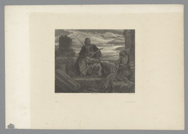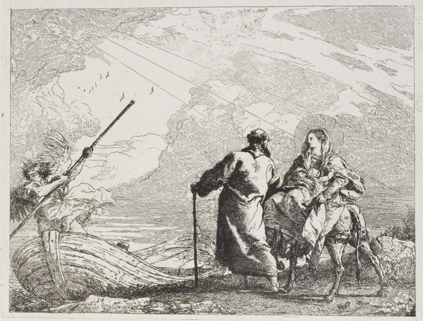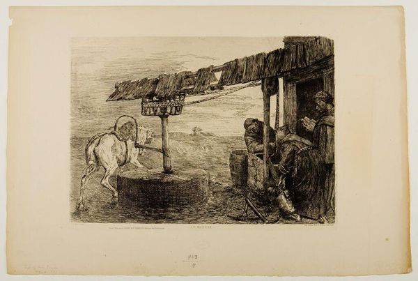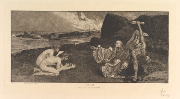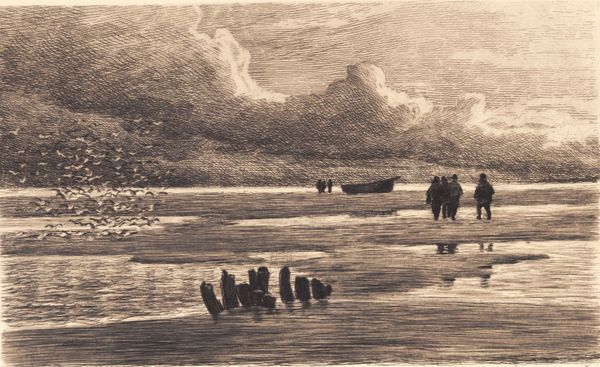 Editor: This is Winslow Homer's "Perils of the Sea," and it looks like an etching. It's undeniably somber; the figures seem weighed down by the environment. What do you see in this piece? Curator: I see a powerful commentary on gendered labor and loss. The women are central, not as passive figures, but enduring witnesses to the dangers faced by men at sea. Consider how the landscape itself mirrors their emotional state. Editor: So, the turbulent sea and threatening sky aren't just background? Curator: Exactly. They actively participate in a narrative of vulnerability and resilience. What does it mean that Homer chooses to focus on those left behind, the watchers, rather than the heroic sailors? Editor: It shifts the focus to the often-unseen emotional labor of women in maritime communities. I hadn't considered it that way before. Curator: Precisely. And it prompts us to consider broader power dynamics within those communities, and who bears the burden of risk. Editor: It's amazing how much is packed into a seemingly simple etching!