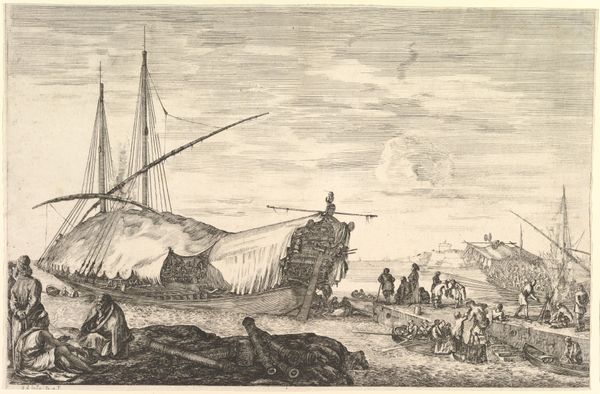 Editor: So this is "Galeischip met afgedekte brug in de haven van Livorno", or "Galley Ship with Covered Bridge in the Port of Livorno," from 1655. It's an engraving by someone known only as Anonymous, at least here at the Rijksmuseum. The light in this piece gives the scene such a feeling of bustling activity despite it being a fairly quiet, even subtle composition overall. What do you see in it? Curator: Oh, this takes me back! To the thrill of imagined voyages, the kind I played out with sticks as masts on windswept beaches. Notice how the covered galley ship almost breathes, doesn’t it? Like a resting beast draped in canvas. It sparks questions: What’s beneath that covering? Treasure? Secrets? And Livorno itself – a bustling port city, teeming with life! I'm immediately drawn to the everyday narratives playing out on the dock. Look at the tiny figures, each engaged in their own dramas! Editor: I hadn't really focused on those figures, but you're right, they each have their own story! It’s so detailed for a print. Curator: Prints were the Instagram of the 17th century, circulating stories and images far and wide. This piece gives us not just a snapshot of a place, but a taste of a whole world in motion. A slice of Baroque life if you will. Does seeing the figures make you wonder about the galley’s purpose even more now? Editor: It does, yes! I now have a thousand new questions. The mundane next to the monumental makes it so compelling. Curator: Exactly! Art isn’t just about grand gestures, it's often about the quiet hum of humanity alongside them. Never be afraid to bring yourself into it, and the artwork will return the favour. Editor: That's such a good way to put it. It gives me a whole new perspective to go forward with. Thank you!