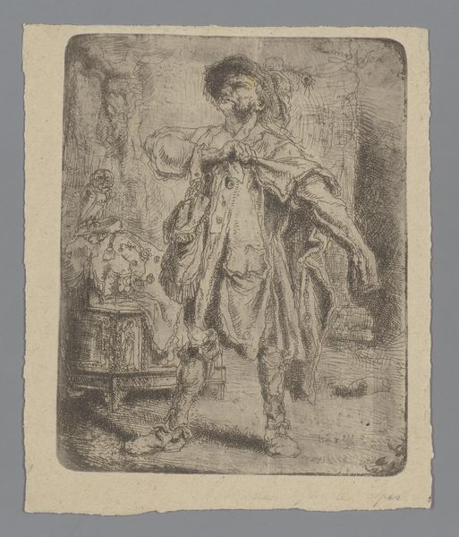 Willem Linnig's etching presents a young man indoors, adjusting his necktie. Consider the etching technique itself. It is an indirect method, requiring the artist to prepare a metal plate, cover it with a waxy, acid-resistant ground, then draw through the ground with a sharp needle, exposing the metal. The plate is then immersed in acid, which bites into the exposed lines. This process demands precision and control, and the resulting image has a distinctive graphic quality. Note how Linnig uses this to full advantage. The density and direction of the etched lines create tone and texture, defining the forms of the figure, the drapery, and the ornate interior. Look closely, and you'll see how the hatching varies to suggest light and shadow, giving depth to the scene. The etching medium lends itself particularly well to capturing intricate details, like the patterns on the wallpaper, underscoring the artistry involved in producing a seemingly simple image of everyday life. Paying attention to the making of the print enhances our appreciation, reminding us of the skills and labor involved in bringing art into the world.