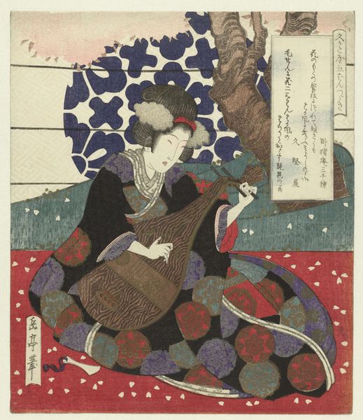 Utagawa Sadakage created this woodblock print, "Bal," around the mid-19th century. It features a figure framed by a gourd-shaped border against a cool, patterned blue backdrop. The lines are delicate, defining forms with soft precision. The composition's structure is intriguing; the central figure interacts with a cat, drawing the eye through a series of interconnected shapes. Observe how the floral patterns on the woman's robe contrast with the geometric regularity of the window behind her. Sadakage employs a semiotic language through these details, hinting at the themes of domesticity and beauty. Consider how the print destabilizes traditional representations by playing with space and perspective, and by employing culturally coded images. The gourd shape, the cat, and the kimono patterns are not merely decorative; they are integral to the artwork's complex visual and cultural narrative, and it is within their interpretation that the ever-shifting meaning of the artwork resides.