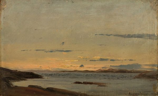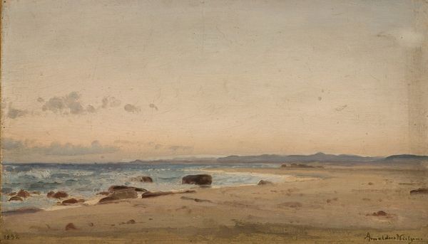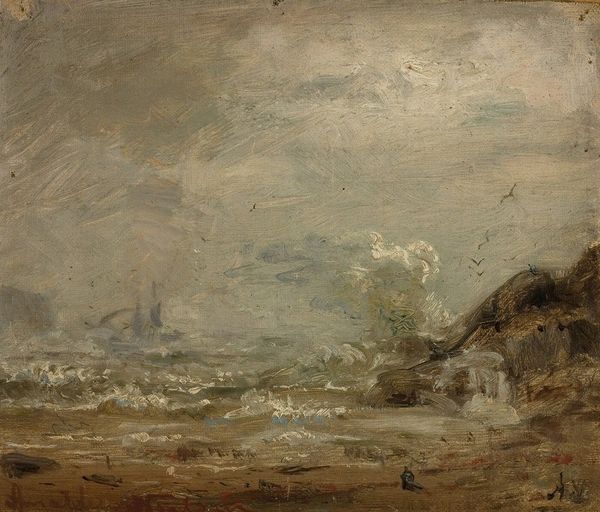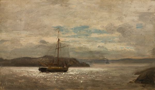 Editor: This is "Regnstemning. Nua, Ryvingen" by Amaldus Nielsen, painted in 1858. It looks like an oil sketch of a rather moody seascape. There's a little boat with orange sails, and you can almost feel the dampness. What do you see when you look at this piece? Curator: Well, immediately I’m drawn to the plein-air aspect, the material conditions of its making. We have an artist outside, contending with the very elements depicted. How does that immediacy translate through the oil paint itself? Consider Nielsen’s brushstrokes: thick, almost hasty, reflecting the urgency to capture this fleeting moment of light and atmosphere. It’s not about a highly polished scene; it’s about process. Editor: So you're thinking about the physical act of painting it, not just the scene itself. Curator: Exactly. Look at the limited palette – the grays, blues, and browns. It wasn't about exotic colours, but the honest hues of the environment around the artist. Romanticism isn't merely an idealized vision, but it emerges from material interactions and the real conditions of painting at the seaside. The oil paint itself embodies the experience of that day. Editor: I never thought about how choosing to paint outside impacted the final artwork so much. Curator: It transforms everything. Now imagine the labour; Nielsen dragging his canvas, his paints, battling against the weather, which itself becomes his subject matter. Even the consumption of materials – the use of precious pigments, perhaps imported, reflecting economic systems—all feed into the final piece we see here. Editor: It gives so much more depth. It's no longer *just* a seascape. Curator: Precisely. We've moved beyond the romantic ideal to see it also as a record of the artist's interaction with, and exploitation of, materials and his engagement with a particular place and time. The "Regnstemning" becomes evidence of production. Editor: This has shifted my understanding entirely; now I see art's story through a different lens. Curator: Excellent. Recognizing the materials and the process transforms our encounter. It deepens our comprehension.
