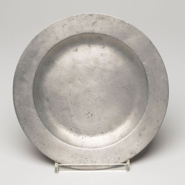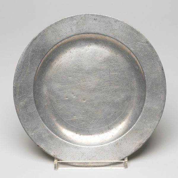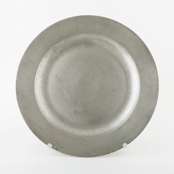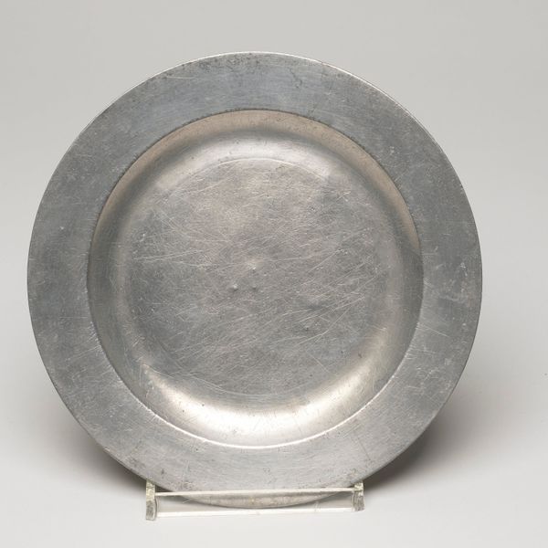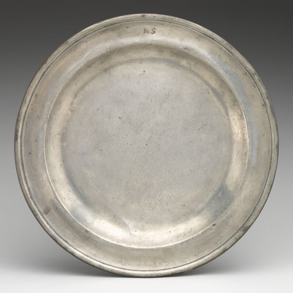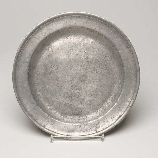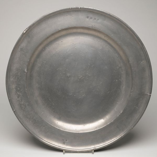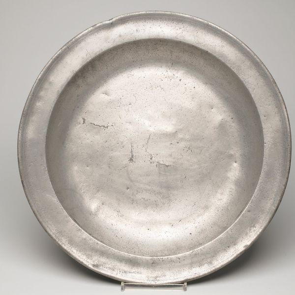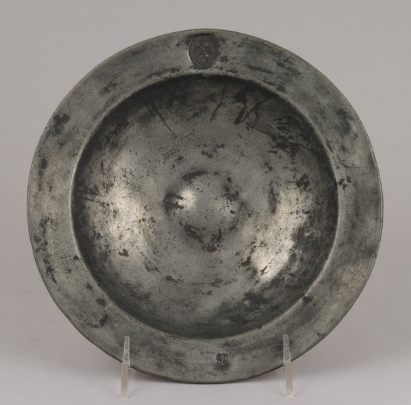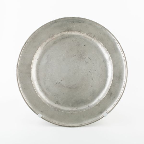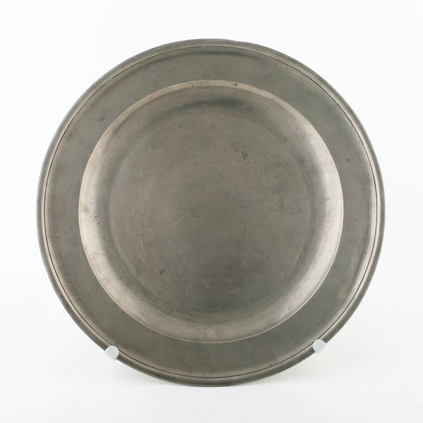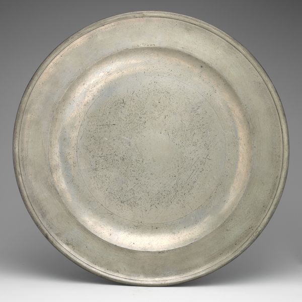This antique plate, of unknown origin and date, presents a fascinating study in form. Its circular shape, rendered in pewter, immediately draws the eye to the interplay of concentric rings. The slightly raised rim frames the central basin, creating a subtle yet distinct division of space. The muted, greyish tones of the metal give the plate a quiet, understated presence. The subtle surface variations and the gentle curvature of the plate work together to give the plate a certain tactile quality. It’s worth considering how the plate's humble design might subtly subvert established meanings around artistic value, given its everyday functionality. The simplicity of its design challenges the viewer to find beauty and interest in the mundane, suggesting that even the most ordinary objects can have a compelling aesthetic dimension. Consider the interplay between form and function and how the plate encourages us to re-evaluate our perceptions of value and aesthetics.