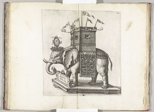 Curator: Here we have an engraving dating back to 1582, whose creator remains anonymous. This print, showcased here at the Rijksmuseum, is titled "Praalwagen met de reus Antigoon op de Grote Markt," which translates to "Float with the giant Antigoon on the Grote Markt". Editor: It looks as if this fearsome, full-bearded dude is literally sitting on his power. I mean, just look at the intricate armor, the feathered helmet… And, oddly, he seems bored? Curator: Indeed! The piece depicts Antigoon, a mythical giant, in a triumphal procession. Understanding the period's socio-political landscape is vital. Think about the Revolt of the Netherlands against Spanish rule – a pivotal point where visual representations became instrumental in shaping public opinion and reinforcing local identity. This imagery can be examined as a political allegory. Editor: Ooh, okay, a parade float with bite! Now the almost casual grip he has on that flag seems more like a warning, a message! The details are extraordinary – that enormous sword balanced just so. Who was the target audience for this engraving at that time, do you think? Curator: Prints like this circulated amongst various social strata, solidifying Antwerp's historical narratives and the struggle for autonomy. Further, by showcasing such floats, these images functioned as early forms of public relations, emphasizing the city's cultural and historical richness during fraught times. It is a clever use of iconography as propaganda, if you will. Editor: Fascinating. Makes you wonder what kind of spin future artists will put on *our* struggles, right? Makes this image oddly... timeless. So much intensity crammed into such a small space. I see his heavy stillness, I hear those rolling parade drums... Curator: Precisely, that the complex layers of history, resistance, and civic pride are elegantly encapsulated here renders it truly compelling still. It offers invaluable insight into how early modern societies mobilized cultural tools to rally collective memory. Editor: I’m definitely marching away with a much richer sense of Antwerp and how people see themselves!