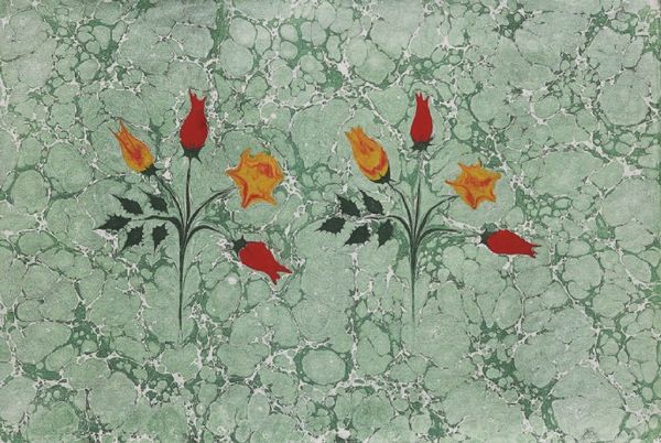 Editor: So, we are looking at "Buket" by Mustafa Duzgunman. It seems to be mixed-media, with tempera and other painting techniques used. The artwork showcases vibrant red and yellow flowers against what looks like marbled paper. It's striking how these floral arrangements stand out against the intricate background, but I can't really tell if they are stenciled in or something else. What do you see in this piece? Curator: This is a fantastic example of Ebru, or Turkish paper marbling. Understanding the history of Ebru as a traditionally secretive art form, heavily guarded by guilds, gives us context. These guilds wielded significant cultural influence, dictating styles, techniques, and even access to materials. Note how the political and social atmosphere of those times, with its strict hierarchical structures, shaped the art. What’s interesting is how the flowers almost defy the fluidity of the marbling, suggesting a tension between control and chance. Editor: Ah, so it's marbling! It seems difficult to get that control on swirling dyes, particularly the way they add these flower shapes in. Were there any power structures involved in this orientalist art, such as, how does the social lens inform its appeal today? Curator: Absolutely! Orientalism, as a lens, frames the "East" through Western eyes, often exoticizing or romanticizing it. In the context of Ebru, particularly in its adaptation for the art market, it can be seen as both a preservation and a commodification of cultural heritage. The institutional support, the exhibitions, and the art market, all play a part in shaping our understanding and appreciation of this work. Consider how the absence of specific dating pushes the artwork closer to appealing to a particular audience rather than focusing on the time and technique. Editor: That’s a fascinating perspective. I hadn’t considered the layers of cultural interpretation and institutional framing involved. Curator: Indeed. It prompts us to question how we perceive cultural heritage, whose voices are amplified, and what gets lost or altered in translation. Editor: Thanks, I definitely see this work in a different light now!