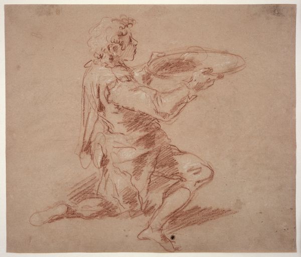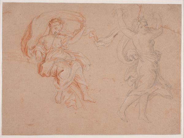 Editor: Here we have Hendrik Krock's drawing, "Halvtliggende, draperet kvindeskikkelse med en bog. Studie af en fod", created sometime between 1671 and 1738, using charcoal and pencil. I'm struck by the contrast between the softness of the figure and drapery, and the isolated, almost clinical, study of the foot. What do you make of this drawing, with its fragmented composition? Curator: It is fascinating how Krock combines the sensual with the intellectual. Notice how the draped figure, referencing classical reclining nudes, is juxtaposed with the anatomical study of the foot. The book in her hand is key. It speaks to a learnedness, perhaps even wisdom, that the female figure embodies. But then, the disembodied foot... What could that signify, separated from the whole? Editor: Perhaps it represents objective observation, distinct from the subjective experience of reading and existing in the world? Curator: Precisely! The foot becomes a symbol of scientific scrutiny, isolated and examined. Think of the Enlightenment values emerging during this period, the push to understand the world through empirical observation. Krock is embedding those emerging values into a traditional form, the reclining nude, and forcing a conversation. What feelings are conjured up with the imagery for you? Editor: There’s something a little unsettling about it now that I consider it more deeply. It's no longer just a classical study, but a commentary on the relationship between beauty, knowledge, and perhaps, a bit of detachment. Curator: Indeed. And the cultural memory encoded here keeps shifting, as viewers bring their own perspectives to unlock these layered meanings, a dialogue across time. Editor: It's amazing how much one can uncover in a seemingly simple sketch when considering its cultural context and the symbolic weight of each element. I learned so much. Curator: As did I. It proves how art can embody many layers and speak across time, as cultural continuity always evolves and regenerates itself.
