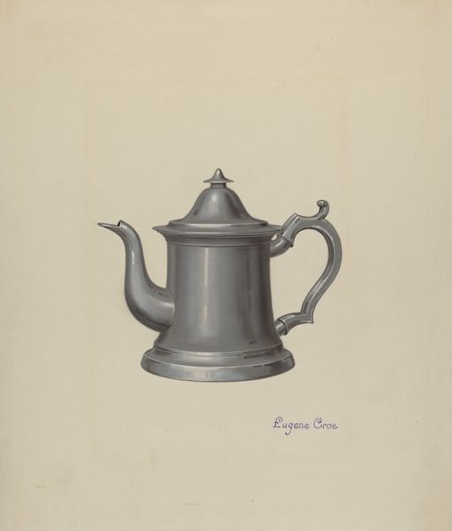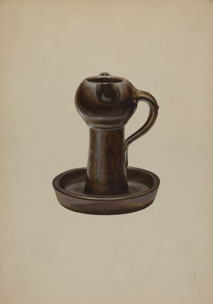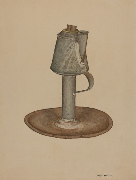 Editor: Here we have Walter Hochstrasser's "Pewter Oil Lamp," created around 1938. It looks like watercolor and colored pencil on paper. It has a stillness to it, almost like a meditation on a humble object. What's your take on this quiet little drawing? Curator: Quiet is exactly the word, isn’t it? To me, this piece speaks volumes in its very simplicity. The way Hochstrasser coaxes out the subtle sheens and shadows of the pewter... It feels deeply personal, almost a quiet conversation between the artist and the object. Doesn’t it remind you of someone pausing in the afternoon light? Editor: Yes, it definitely has a certain domestic intimacy to it. The light seems to cling to the metal. It looks both old and new, somehow. Did the artist intend for this object to signify anything beyond its appearance? Curator: Well, art is never just "appearance," is it? I like to imagine him considering how light makes a thing new, each sunrise or sunset… There's a tangible quality here, but it feels more internal somehow than literal. How would you say he uses realism in this watercolor? Editor: I think he elevates a common object to something more significant. Almost romantic, how it captures light. This makes me look at other ordinary objects as though they hold an inner light. Curator: Beautifully put! And isn’t that the power of art, really? To transform the mundane into the magical and to see beauty in the seemingly ordinary? Editor: Absolutely! This has definitely opened my eyes. Thanks for this different look!