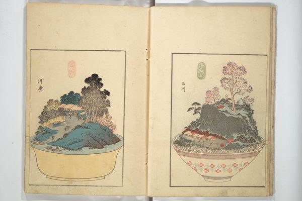This is a page from "Moyō hinagata miyako no nishiki," a textile pattern book made by Kichirobe Yamanaka. These designs for kimonos are printed with woodblocks, a process that demands meticulous carving and registration to achieve the crisp lines and vibrant colors that you see here. Consider the context of production. Woodblock printing in Japan was an established industry by this time, involving designers, carvers, printers, and publishers. These books played a key role in shaping popular taste and driving the demand for luxury goods like kimonos. Notice how the designs integrate natural motifs – flowers, streams, and landscapes – into the very structure of the garment. The patterns aren't just applied to the surface; they become part of the kimono's identity. This reflects a deep cultural connection to nature and an appreciation for the skilled labor required to produce such intricate designs. By understanding the materials, the making process, and its cultural significance, we gain a richer appreciation for this beautiful object, and how design permeates everyday life.