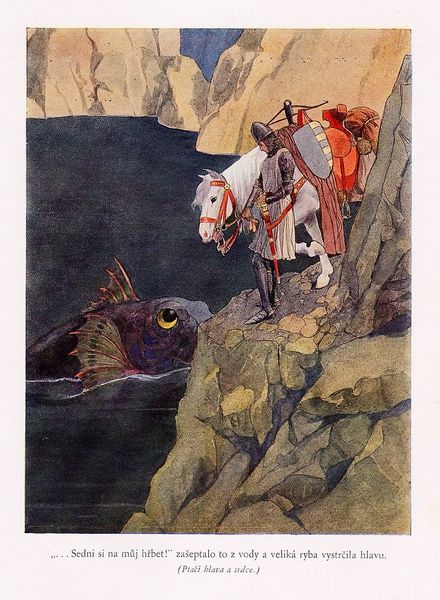 Ivan Bilibin crafted this illustration for the tale of Prince Ivan using ink and watercolor, capturing a pivotal scene filled with symbolic weight. Here, the skull and bones at the base of the inscribed stone evoke the memento mori, reminding us of the transience of life. This symbol echoes across time, appearing in ancient Roman art and medieval Christian iconography, always urging reflection on mortality. The inscription itself points to a deeper cultural anxiety—the quest for knowledge and the perilous path it entails. This motif resonates with the story of Oedipus or even Faust, each representing the human desire for understanding and the potential for tragic downfall. The artist uses a stark contrast, placing these symbols alongside the naive figure of the prince and the stoic white horse, as if to heighten the narrative tension. The horse serves not only as a means of transport but as a symbol of guidance and loyalty. The psychological interplay of life and death, innocence and experience, creates a powerful emotional pull, inviting viewers to confront their deepest fears and aspirations.