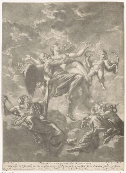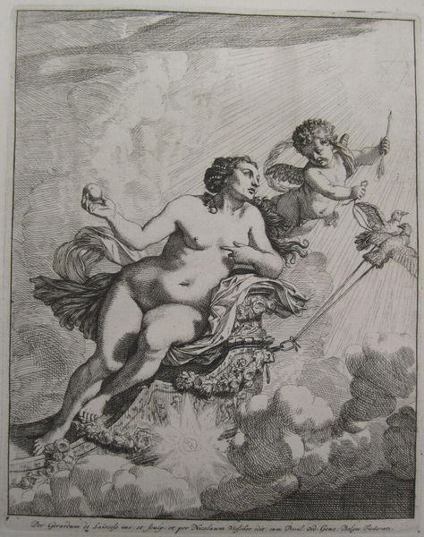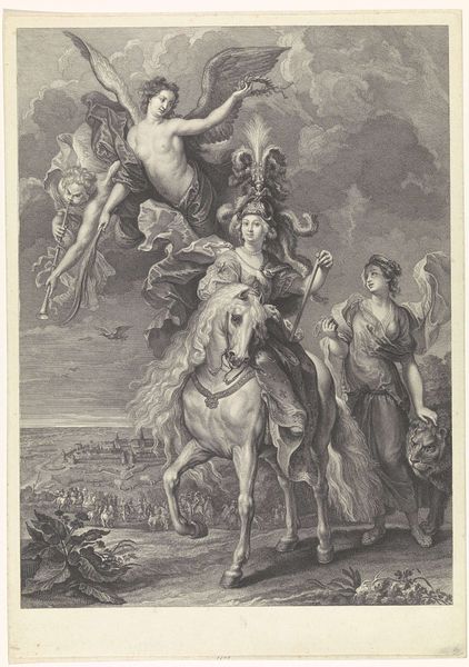 Curator: Oh my! The drama! Looking at this print, I feel swept away…literally. Editor: Indeed! This is Jean Audran's "The Centaur Nessus Carries Off Deianira," now residing at the Harvard Art Museums. It captures a pivotal scene from mythology. Curator: The swirling drapery, the desperate reaching…it’s all so wonderfully theatrical. But the centaur's face seems almost…exultant? It’s unsettling. Editor: That's the tension Audran so brilliantly captures. It's a tale of betrayal, violence, and the abuse of power, filtered through a baroque lens. Nessus was tasked to ferry Deianira across the river but decided to carry her away, prompting Hercules to shoot him with a poisoned arrow. Curator: It’s a potent reminder that behind grand gestures and flowing lines, there's often a darker narrative simmering. Editor: Precisely! The artwork reminds us that historical pieces are never just about what is shown but about understanding the social and ethical narratives of their time. Curator: It makes you consider: who truly benefits from these dramatic displays? Editor: An important reflection, indeed.