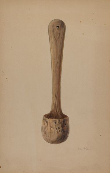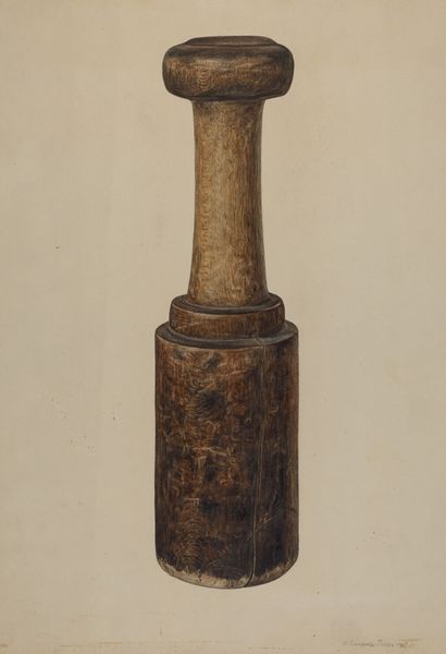 Curator: There's a quiet solemnity to this work, don't you think? It's a charcoal and pencil drawing titled "Potato Masher," created around 1940 by Luther D. Wenrich. Editor: I do see it. There is something so stoic about it, a monument to the mundane. The vertical composition immediately directs the eye upwards, segmenting into rhythmic anatomical details... Curator: The potato masher as a humble artifact, imbued with significance beyond its utilitarian function. The form certainly echoes architectural or even figural archetypes across many eras, doesn’t it? Perhaps a link to the act of nurturing and transformation... Editor: It’s clearly a realism, but there is such formal focus here. The way Wenrich articulates the gradations of light across the curved surfaces is truly admirable. You can almost feel the texture of the wood. The shadow details suggest a very intentional geometric interplay. Curator: Yes, the interplay of light and shadow contributes to its sense of timelessness. Beyond being just a utensil, this becomes a symbol of the past, domesticity and memory itself. Perhaps something that calls for our appreciation to the rituals that bond humans, especially those associated with family heritage. Editor: Agreed, it transcends mere representation, doesn't it? This is an interesting perspective on the power of everyday objects, how the seemingly ordinary carries significant visual, and even philosophical, weight when looked at from a design aspect. Curator: The artist gives significance and transforms it, that otherwise mundane artifact. It becomes part of the collective experience. Editor: Indeed, after all, it certainly prompts a consideration for what lies just beyond the purely visible and reminds us of what makes up our reality as a constructed experience, from function to memory and more.