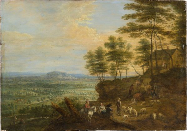 Editor: So, this is Jacques d'Arthois' "Landscape with Entrance to a Forrest," painted around 1650. It's an oil on what looks like maybe a wood panel. There's this almost theatrical light filtering through the trees, and the scene feels really staged. What stands out to you? Curator: Well, consider the source of the materials. Oil paint, even then, wasn't uniformly produced. Who controlled pigment production, and how would that influence Arthois' access? The wood panel also raises questions about trade networks and resources available to him. Editor: That’s interesting, I hadn't really considered the actual trade of paint pigments. Do you think that shaped the colors and what he could render? Curator: Precisely. Pigments weren't simply colours; they were commodities. The vividness, even the limitations of the palette, speak to Arthois' place within that economic and material network. Think about how the ‘plein-air’ technique is tied to both artistic expression and the burgeoning accessibility of materials for outdoor work. The very act of painting outside becomes a statement of changing social dynamics of the time. How is access being displayed? Editor: So, instead of just seeing a pretty landscape, we’re also looking at a snapshot of 17th-century industry and accessibility? Curator: Exactly. Even the forest itself could be read as a resource, controlled or contested. Look at the detail; it’s not just nature, it's a resource depicted and shaped through artistic labour, distributed, and consumed, offering us a window into its making. Editor: I'm starting to see landscape paintings in a whole new way now, less about aesthetics and more about what went into actually making it. Thanks for sharing that, that really changes the game. Curator: And that understanding reframes how we view art's relationship with labor and the environment. There are many points to reflect on to inform a broader understanding.