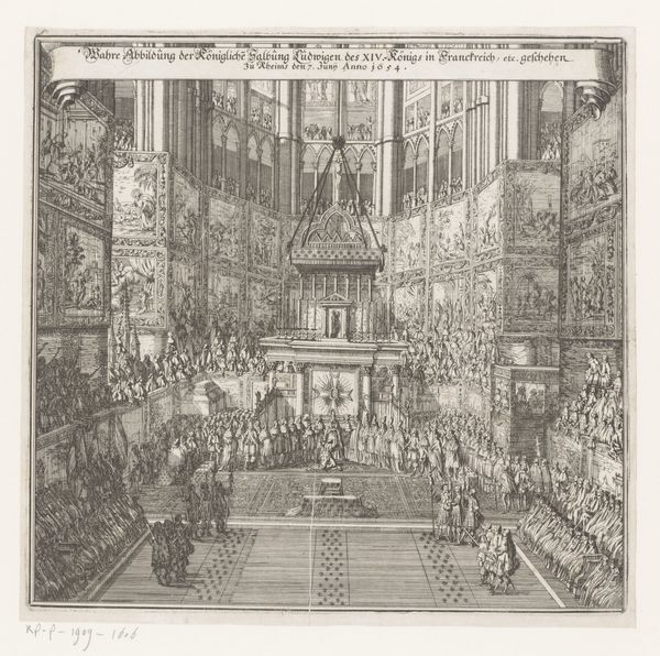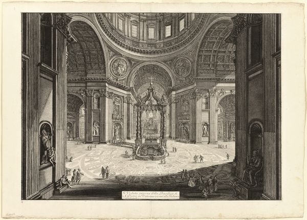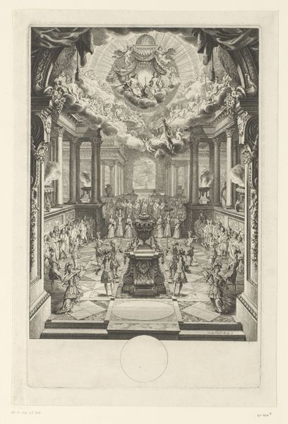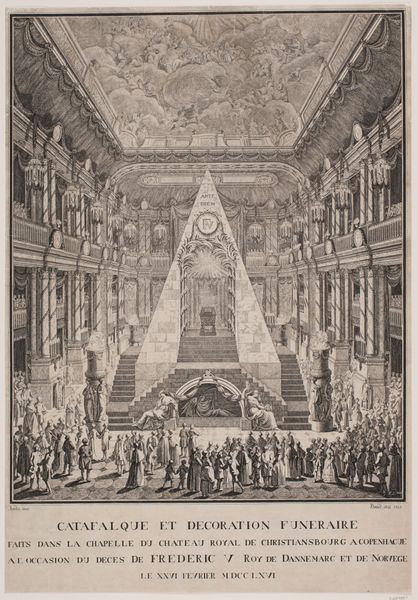 Curator: Standing before us, we have "Christiansborg Slotskapel med Frederik V.s katafalk," a detailed rendering, an etching by Nicolas-Henri Jardin from 1766, presently held in the collection of the Statens Museum for Kunst. The work presents an elaborate state funeral. What springs to mind when you first look at it? Editor: Honestly? That pyramid. I mean, beyond the expected opulence of a royal ceremony, this overwhelming pyramid dominates the space. It is quite the statement piece. It’s a very precise and formal kind of sadness depicted here, isn't it? Curator: The pyramid as a symbol! Its usage in Baroque art serves as both an ancient reference and, potentially, a visual metaphor for stability and eternal life, wouldn't you say? Consider the architectural precision of the piece too, with the symmetry emphasized by Jardin's careful draftsmanship. It lends the whole scene a sense of frozen grandeur. Editor: Definitely a frozen grandeur. The composition makes use of symbols within symbols. The light emanating from within the pyramid, juxtaposed with the somber figures below, tells a clear story, a symbolic passing, almost as if visually echoing concepts of rebirth or ascension... though the mourners remain fixed to their grief. Are there any other peculiar things in the print to examine closer? Curator: Notice the intricate ceiling fresco rendered as meticulously as the architecture below, heavenly host overlooking earthly mourning, reflecting how baroque loved dramatic, contrasting ideas. Editor: And the way the architectural lines all converge, forcing our eyes upwards... fascinating how architecture and set design were employed to project very specific cultural and political narratives. It is as if the print immortalizes a carefully performed ritual. Curator: A carefully staged performance, precisely. And through Jardin's rendering, that performance becomes a historical document. What will resonate, perhaps, with our contemporary viewer about it? Editor: Perhaps it's that strange mix of over-the-top pomp and profoundly personal grief. Both eternally relevant, wouldn't you agree?