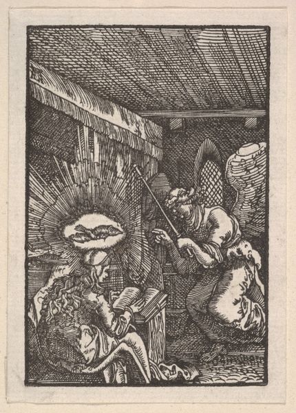 Curator: Albrecht Altdorfer’s woodcut engraving, "Saint Jerome in a Cave," likely created sometime between 1480 and 1538, draws us into an intensely personal and deeply textured space. Editor: Immediately, I’m struck by the stark contrast of light and shadow, and how that shapes the feeling of confinement within this craggy grotto. It feels both intimate and overwhelmingly vast. Curator: Absolutely. Altdorfer masterfully uses the woodcut medium. Consider the labor-intensive process, where lines are carved away to leave only the image to be printed. Think about the physical act, almost a devotion of mark-making in its own right. How does that relate to the solitary asceticism represented in Saint Jerome's life? Editor: It echoes it perfectly. And look at how symbols intertwine—the lion, traditionally Jerome's companion, isn't just an animal, it is testament to the saint's miraculous abilities to heal. The cave itself isn’t just shelter; it symbolizes both physical and spiritual retreat, a crucible for transformation. Curator: Note the careful layering. This isn’t just about depicting the textures of stone or fur. The density of the marks also shapes emotional resonance. I'd say that's precisely how the northern renaissance utilized labor so intricately, allowing material and symbolic density to commingle. Editor: I agree. The grotto appears not just as a refuge, but almost a character in its own right, mirroring Jerome’s own internal landscape. What appears natural and untouched clearly has signs of craft from the structure he built. A lot to contemplate for someone so immersed in nature. Curator: So many fascinating tensions are held in the crafting and representation of the image! The tools that have made it also allow for more intimate, contemplative relationships to occur between the saint and viewer, mediated by devotional iconography. Editor: Exactly. Looking closely reveals such dedication to the making and the meanings of Altdorfer's prints. Curator: Indeed, something to savor, this connection to devotional experience mediated through printmaking techniques. Editor: Agreed. It will stick with me as an important part of Northern Renaissance art.