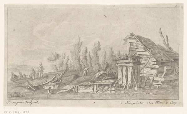 Curator: I’m struck by the way the scene feels caught between tranquility and… imminent collapse? There’s something unsettling in the architectural decay amidst this picturesque landscape. Editor: I’m pleased you picked up on that! What we’re looking at here is an etching called "Heuvellandschap met twee hutten aan het water," or "Hill Landscape with Two Huts on the Water," by Carl Friedrich Holtzmann, created sometime between 1750 and 1811. Curator: Holtzmann, yes, I know the name… that Romantic era yearning for nature and the sublime, but tinged with anxiety about its impermanence. You really get that sense here! It's not just the tumbledown shacks, it's in the shaky lines. Editor: Absolutely. His technique with the etching—the linework being quite deliberate, but also leaving space and airiness. This was a period increasingly aware of nature both as a balm and a source of tremendous, untameable power. You can see echoes of the Gothic, even. Curator: Right? Look how the artist draws the lines. The image isn’t really polished and you can see Holtzmann is prioritizing certain strokes and structures over others. How does the image itself fit into that growing public perception, though? I mean, beyond just being beautiful? Editor: That's key. These landscapes helped to create, to codify, what a properly "picturesque" scene should be—wild, but with elements of human habitation, reminding the viewer of both nature’s power and humanity’s ability to find its place within it. But, as you pointed out, there’s always this looming sense of ruin! A premonition? Curator: Possibly. There are two figures off to the side as well and in my opinion, their existence further adds to that sense of a need for this kind of exploration, especially among people removed from these areas. I can certainly appreciate the role it plays in romanticism more broadly! Editor: Indeed. Perhaps a meditation on man’s relationship with the environment as well. Something we’re still trying to sort out centuries later. Curator: Well, after looking at the details of its history, I feel that romanticism tug even more now. Thanks! Editor: You too! A fascinating little engraving that gives one quite a lot to ponder.