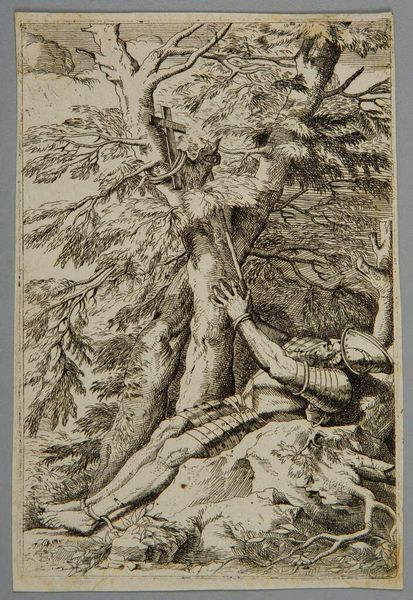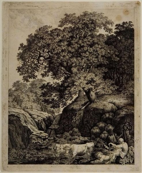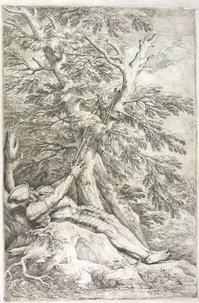 Editor: This etching by Salvator Rosa depicts the Finding of Oedipus. It's incredibly detailed. What strikes me is the dense forest setting; it feels almost theatrical. How do you interpret this work within its historical context? Curator: Salvator Rosa, active in 17th-century Italy, often explored themes of the sublime and the dramatic. Here, Rosa engages with the classical narrative of Oedipus, placing it within a wild, untamed landscape. Consider how this contrasts with the more ordered landscapes favored by other artists of the period. What could that suggest about the public role of art during that time? Editor: Maybe Rosa is commenting on the unpredictable nature of fate, contrasting human drama with the indifference of nature? Curator: Precisely. And how might the use of etching, a printmaking technique allowing for wide distribution, influence the reception and political implications of the imagery? Editor: I hadn't thought about the political implications of printmaking itself. Curator: Rosa uses his art to engage in social commentary, highlighting themes of fate and power through accessible imagery. Editor: This really highlights how artistic choices can transform even classical tales into powerful statements.