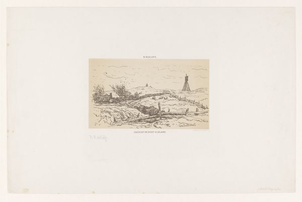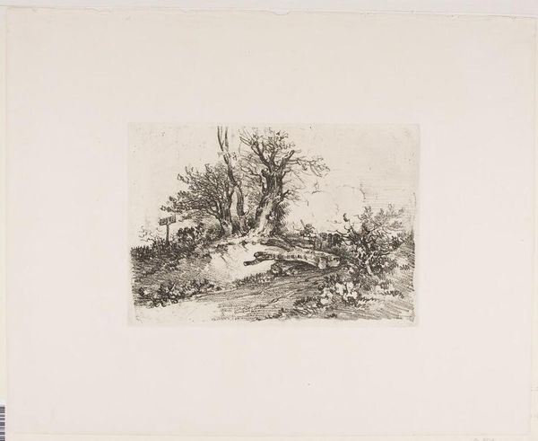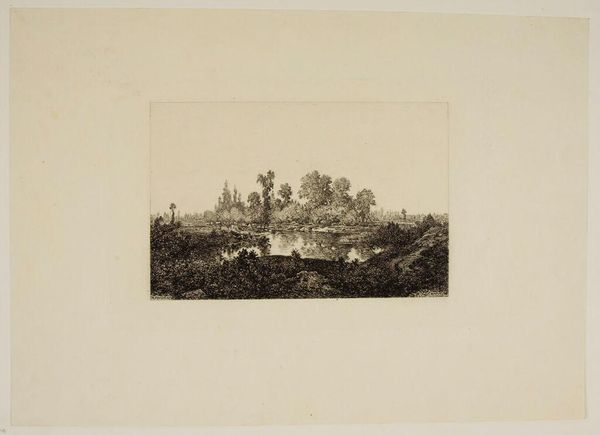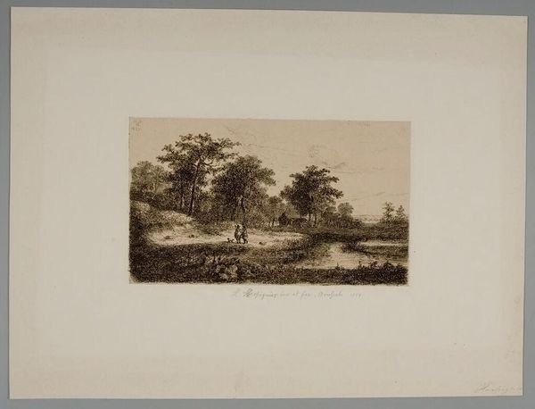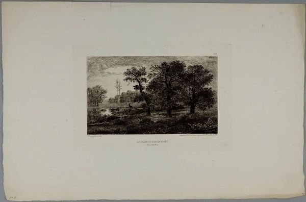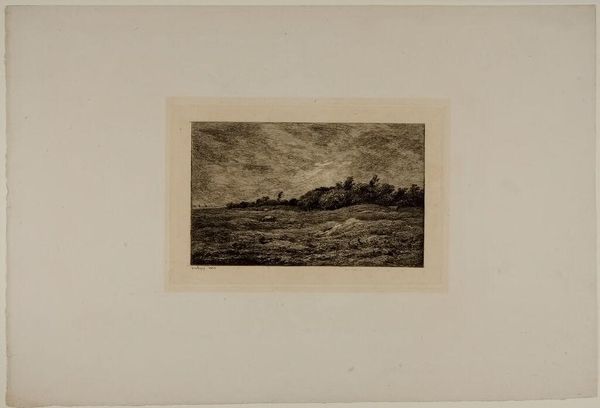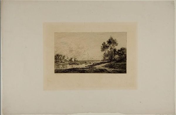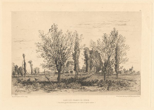 Editor: This is "Dans les champs de Cenon" by Maxime Lalanne. It’s a delicate etching, and the scene feels so quiet and rural. What can you tell me about it? Curator: Lalanne was a key figure in reviving etching as a fine art in 19th-century France. This work exemplifies the era's fascination with rural life, yet it's not simply picturesque. How might the rise of industrialization have influenced the popularity of such scenes? Editor: I guess people romanticized the countryside as cities became more industrialized and crowded. Curator: Exactly. It also speaks to a growing national identity, connecting with the land. Lalanne’s technical skill also elevated etching to be viewed alongside painting. Editor: That gives me a new perspective on it. Thanks! Curator: A pleasure. Considering the social context always enriches our understanding.