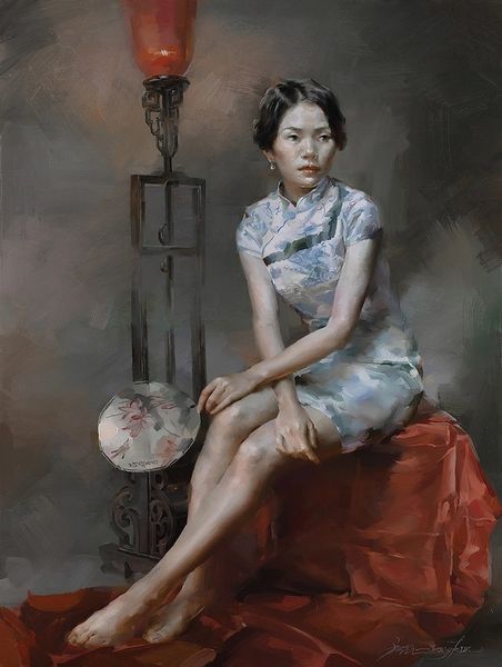 Julie Bell's painting presents a figure draped in a shimmering, golden robe, seemingly lost in contemplation or reverie. The robe itself, with its flowing lines and luxurious fabric, suggests a connection to classical drapery, echoing the garments of ancient statues of goddesses or nymphs. This motif of draped figures appears throughout art history, from ancient Greek sculptures to Renaissance paintings, often symbolizing status, beauty, and the idealized human form. Yet, the act of being draped can also signal vulnerability or exposure, a state of being caught between concealment and revelation. We see echoes of similar motifs in Renaissance depictions of Venus or Danaë, where the sensuality of the subject is heightened by the artful arrangement of fabric. In Bell's work, this dynamic interplay continues, engaging us on a subconscious level and stirring emotions of empathy, as we become drawn to the subject's emotional interiority.