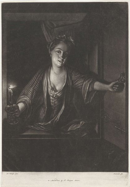 This print, titled "Smaak" or "Tasting," was created by Alexander van Haecken in the 18th century using a mezzotint technique. This printmaking process involves roughening a copper plate with a tool called a rocker, then smoothing areas to create lighter tones. The velvety texture and subtle gradations of light and shadow achievable through mezzotint lend themselves well to depicting skin and fabric. It's a labour-intensive process, demanding skill and precision. The softness of the medium gives this print the look of a chalk drawing. This one is a study in the sensuous—the textures of the skin and cloth, and especially, the implied taste of the fruit that the figure holds to her lips. Mezzotint was often used for reproducing paintings, making art accessible to a wider audience, and this print shows how a handmade process could participate in the developing culture of mass production and consumption. The image thus belongs to two worlds at once: the rarified realm of fine art, and the more down-to-earth world of getting and spending.