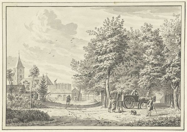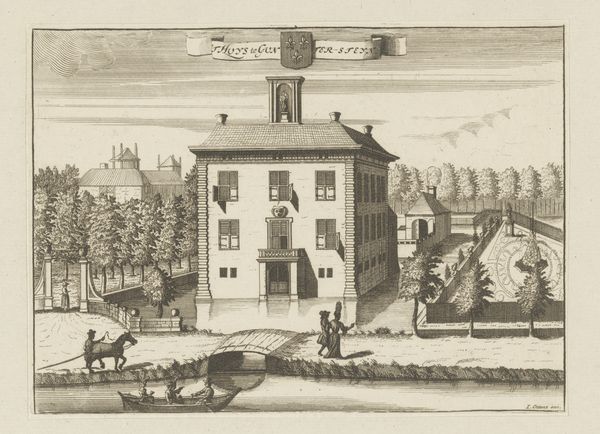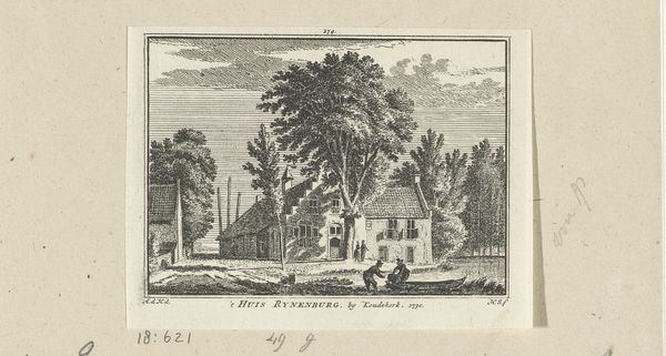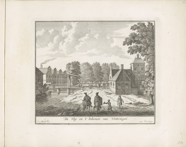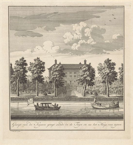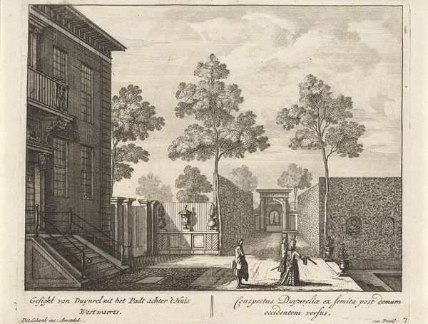Editor: Here we have "View of the back and part of the garden of the Corvershof in Amsterdam," an engraving by Jan Smit made sometime between 1723 and 1748. It's so detailed and calm, a snapshot of daily life, but very ordered. What do you see in it? Curator: I see a carefully constructed representation of power and social control, carefully disguised as a genre scene. Look at the Corvershof, an old men’s almshouse. It looms large, a structure literally built on the backs of the vulnerable. Notice how the people working on the grounds are smaller and less defined. The almshouse creates a backdrop for the leisure of the three bourgeois strolling in the front, separating them from the less-fortunate residents of Amsterdam. Who does the image serve? Who is invited to look at this image and reflect upon this social hierarchy? Editor: That’s a stark way of looking at it, I hadn't considered it like that. I was focused on the trees, the perspective… the atmosphere. Do you think the artist consciously intended that message? Curator: Perhaps not consciously, but art doesn't exist in a vacuum. Smit, as a member of that society, would have been influenced by its prevailing power dynamics. We can still appreciate the skill, but also critique the underlying social messages embedded within it. Consider also the print medium. Who could afford these? The rising merchant class of the Dutch Golden Age, the very audience that reinforced these structures. Does it begin to paint a clearer picture? Editor: It does. So, it's not just about what's in the image, but who the image is *for*, and what it subtly reinforces about society at the time. Curator: Precisely! It invites us to look closer at how power operates through seemingly innocuous everyday scenes. We can question the image and its message as opposed to passively admiring it, considering it 'of its time'. Editor: Thanks, I will keep these ideas in mind during my next visit to the Rijksmuseum. Curator: And always remember that art is more than just aesthetics.