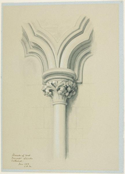 Curator: This drawing by Charles Herbert, titled "Capital, Triforium of Choir, Notre Dame, Paris," offers a detailed study in pencil and brown wash. I find the isolated presentation so striking. Editor: Yes, there's a hushed, almost reverential quality in its formal rendering. Note the classical acanthus leaves, reinterpreted within the Gothic frame of Notre Dame. Curator: The capital is a potent symbol here; it’s the crowning achievement, isn't it? It literally mediates between the earthly support of the pillar and the heavens the cathedral aspires to touch. Editor: Absolutely. And Herbert has carefully rendered the play of light and shadow, emphasizing its three-dimensional form and the semiotic weight it carries within the architectural whole. Curator: Herbert captures the cathedral's ambition, its yearning for the divine, in this small piece of stone. Editor: Indeed, the drawing evokes the cathedral's cultural and spiritual significance through pure form.