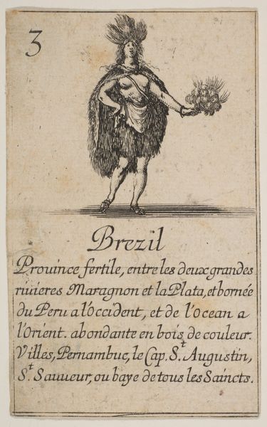 This playing card, "Gold Coast", was made by Stefano della Bella in the mid-17th century using etching, a printmaking technique that democratized image production. An etcher covers a metal plate with a waxy ground, then scratches an image into the ground with a needle. The plate is then bathed in acid, which bites into the metal where it has been exposed. Here, the figure of an indigenous person is presented for European consumption, complete with feather headdress and skirt. The etched lines give the figure a delicate appearance, yet the card itself speaks to a anything but delicate history: the brutal economics of colonialism. The text on the card notes that the depicted region is “sterile, but yields a quantity of gold.” The card conflates the landscape with its inhabitants, suggesting that the "Gold Coast" is a kind of mother lode to be extracted and consumed. This speaks volumes about the relationship between image making, the commodification of land and people, and the aesthetics of power.