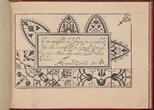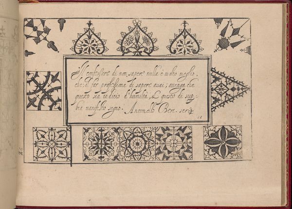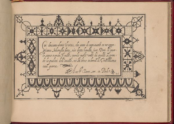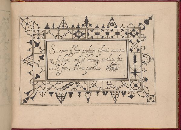 This is a page from Pietro Paulo Tozzi's "Ghirlanda," created around 1604 with pen and ink. The border of the image is decorated with a sequence of geometric motifs whose origins are entrenched in the cultural memory. We see here a series of crosses, wheels, and rosettes, symbols that have transcended time and geography. The repeated motif of the cross, a symbol pre-dating Christianity, appears here in many forms that link it to ancient solar symbols. These wheels speak to an enduring human fascination with the sun, an object of worship and a representation of the cyclical nature of life. Consider how, across civilizations, the rosette appears, from ancient Mesopotamia to the Renaissance, it often represents divine beings. The subconscious allure of these symbols may stem from their association with nature's powerful forces, which touches us on a deeply human level. These symbols are not stagnant; they are continuously being reshaped and reinterpreted by culture. The image's power lies in its capacity to trigger an unconscious connection to a rich, shared past.