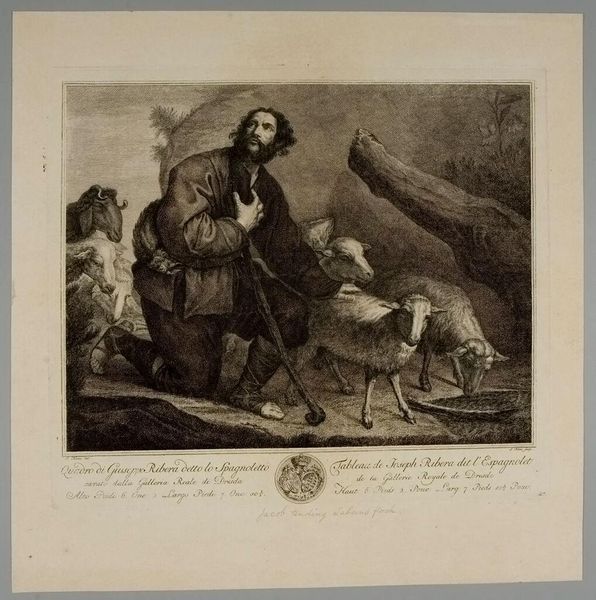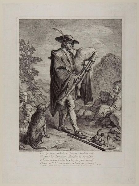 Editor: Here we see "The Chimney-Sweep" by Jacques Dumont. It's a print, and the figures are really striking. The textures in their clothing are quite detailed. What story do you think this image is trying to tell? Curator: Dumont presents us with a raw depiction of labor and childhood in the 18th century. Consider the social dynamics at play: the child's labor supporting the family unit, the mother's burden, perhaps the absence of the father. The print itself is an act of social commentary, made accessible through its medium. Who was this print intended for? Editor: So it's bringing awareness of societal issues to a wider audience. I hadn’t considered the print's accessibility. Curator: Precisely. The distribution of prints like these contributed to a growing public consciousness and dialogue around social inequalities of the era. Editor: That's a new way to view this piece and others like it. I'll consider this social commentary more deeply moving forward.