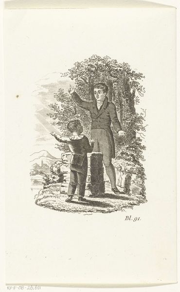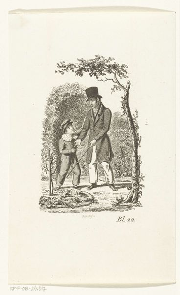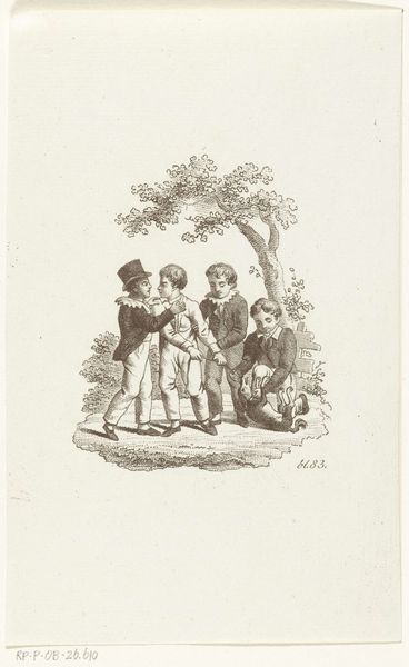 Curator: Here we have an ink drawing on paper from Johannes Alexander Rudolf Best, dating between 1807 and 1855. Its title translates to "Father with two boys in his arms and mother, sitting in garden by two dogs." What are your immediate impressions? Editor: Well, the most striking thing is the almost saccharine domesticity. It presents a picture of idyllic family life, with very clean lines and an incredibly still, posed arrangement. Almost too perfect. Curator: It is fascinating how the artist uses the conventions of Romanticism to depict bourgeois domesticity. The positioning of the father as the central figure, cradling the boys, speaks to notions of paternal authority and emotional connection. The mother, while present, occupies a more passive role. We must consider how such a depiction reinforces prevailing gender norms of the time. Editor: Indeed. The formal composition also interests me. Note how the artist has grouped the figures centrally, framed by the trees and architectural detail of the home behind. It creates a sense of enclosure and self-containment, further reinforcing the idea of the family as a distinct, protected unit. I wonder what semiotic readings one might have for the repeated appearance of canines in similar period works... Curator: Through an intersectional lens, one can analyze the visual representation of class in this piece. The well-dressed family, the manicured garden, and even the presence of dogs as pets, signals a certain level of privilege and economic standing. This is not simply a portrayal of familial love, but also a subtle display of social status and bourgeois ideals. Editor: Absolutely. The execution of the work seems rather skillful in modulating line and tone with such restricted palette, drawing one's eyes towards the interiority of the image despite its simple narrative scene. Do you find it to have succeeded in expressing any particular emotional nuance through those aesthetic decisions? Curator: The drawing underscores the socio-political constructs embedded within the family unit during the early 19th century. Its idealized vision serves to naturalize power structures and gender roles. It’s also an intimate depiction, offering glimpses into personal lives and aspirations during a pivotal era. Editor: Indeed, and I find my attention shifting again toward the dogs – creatures bound to both labor and leisure in that period. Each compositional choice tells an intriguing piece of a story, with technique being as equally a factor of import as content matter itself. Curator: A pertinent observation to keep with us when reflecting on similar drawings of that era.